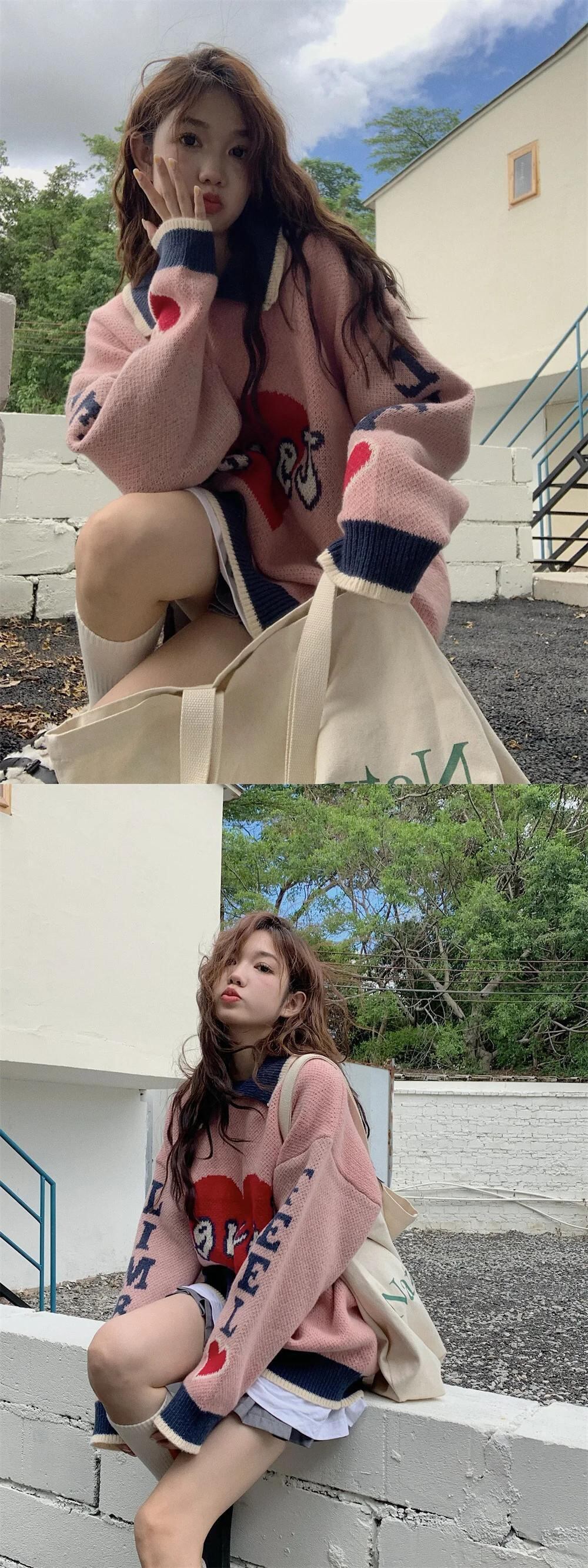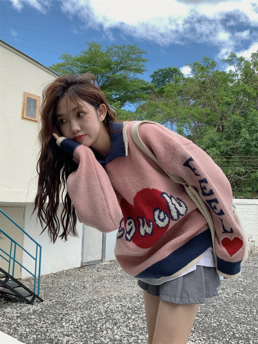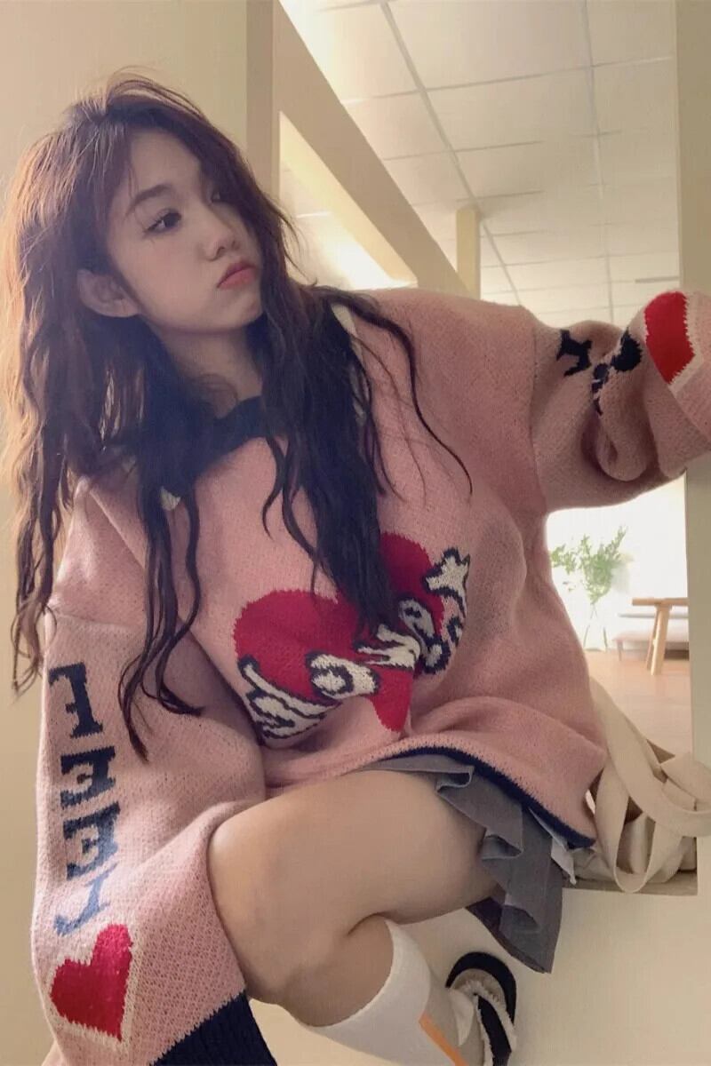Sweet Girl ハートジャカードセーター秋/冬長袖ルーズミッドレングスニットプルオーバー ロング 大人ガーリー スウィート キュート カジュアル オータム 秋物 ウィンター 冬物