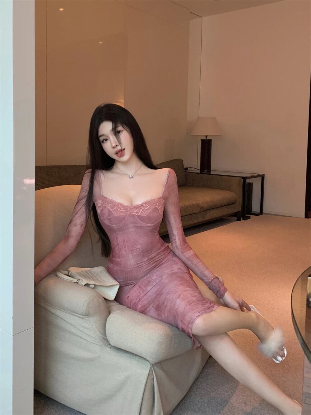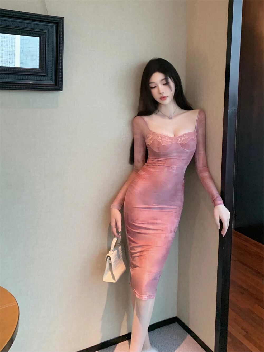 フレンチホットガールスクエアカラーメッシュ長袖レースドレス秋レースウエストミッドレングスドレス ロング オータム 秋物 スクウェア