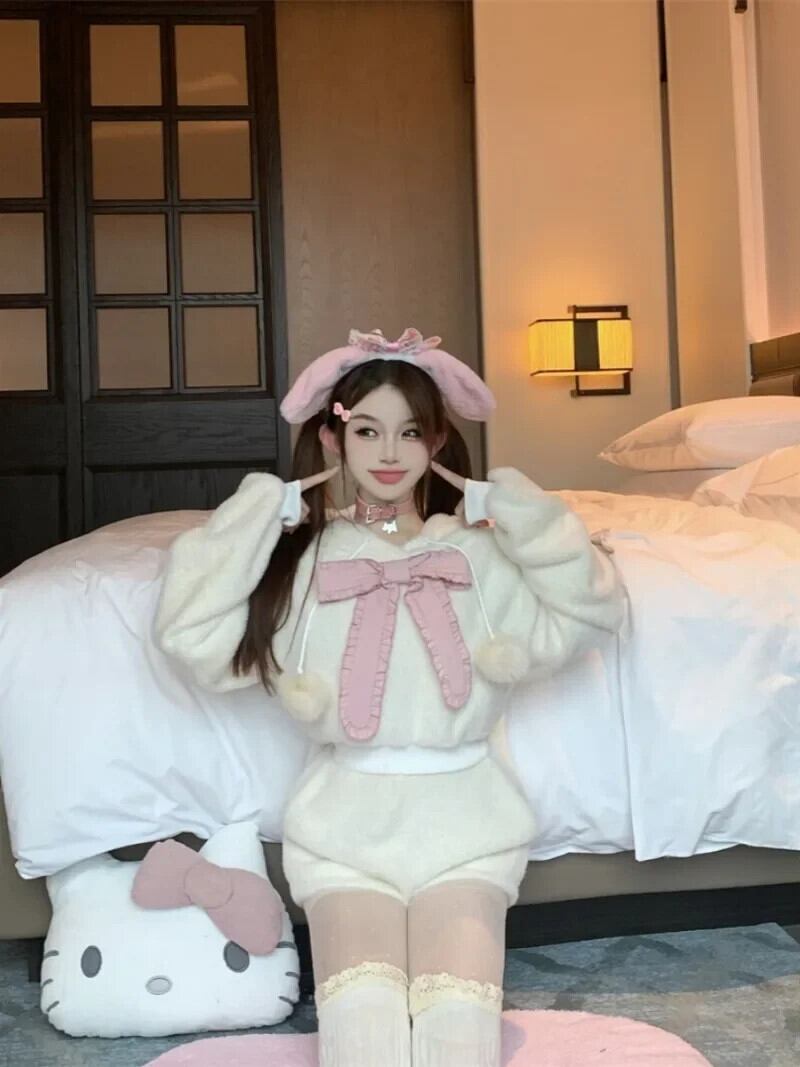 スイートガールスーツ レディース 秋/冬 リボン ウサギ耳 フード付き スウェットシャツ ぬいぐるみ ショーツ ホワイト ツーピースセット 大人ガーリー スウィート キュート カジュアル オータム 秋物 ウィンター 冬物 ブルマー