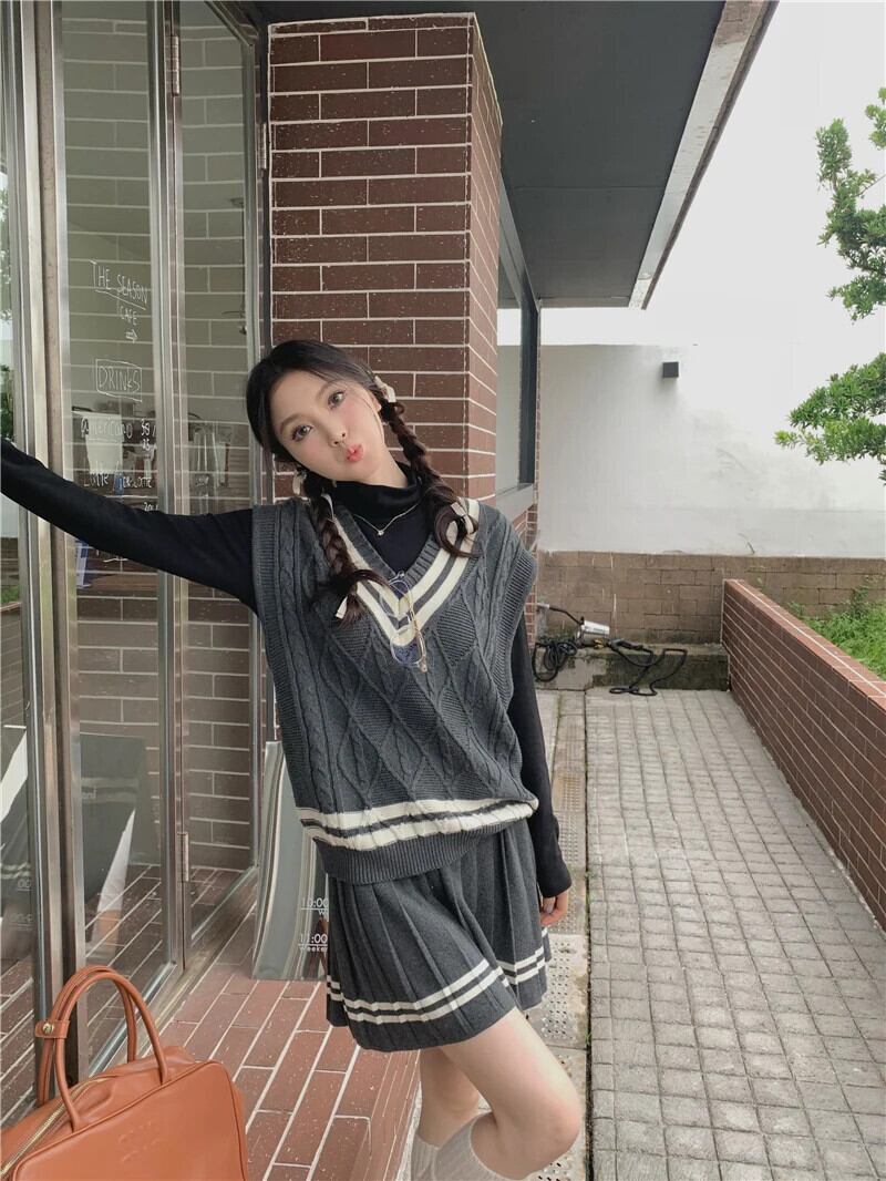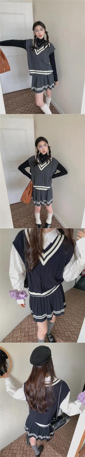 スイートガールスタイルスーツ冬コントラスト V ネックベストウエストプリーツスカート 2 点セット 大人ガーリー スウィート キュート カジュアル ウィンター 冬物 Vネック