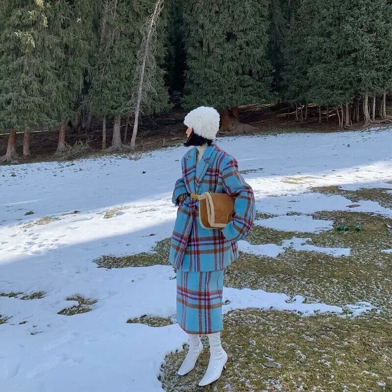 甘いホットガールレトロスーツ冬ラペルウールジャケットチェック柄ロングスカートツーピースセット 大人ガーリー スウィート キュート カジュアル ウィンター 冬物