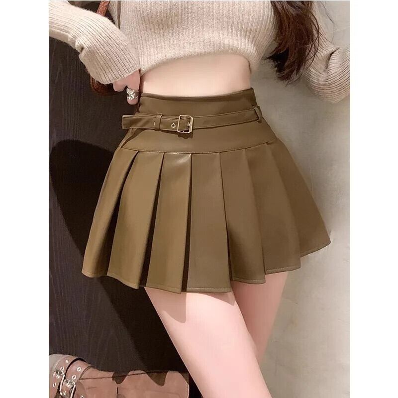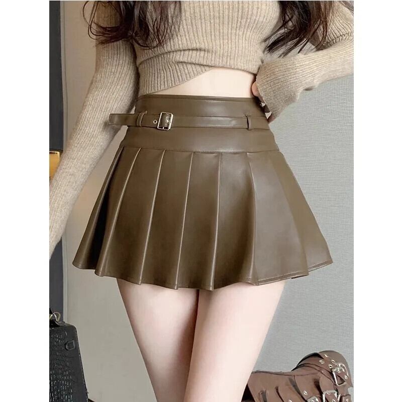アメリカンスウィートホットガールズスタイルウエストスカートレディース秋冬レースアッププリーツPUレザーショートスカート 大人ガーリー キュート カジュアル オータム 秋物 ウィンター 冬物