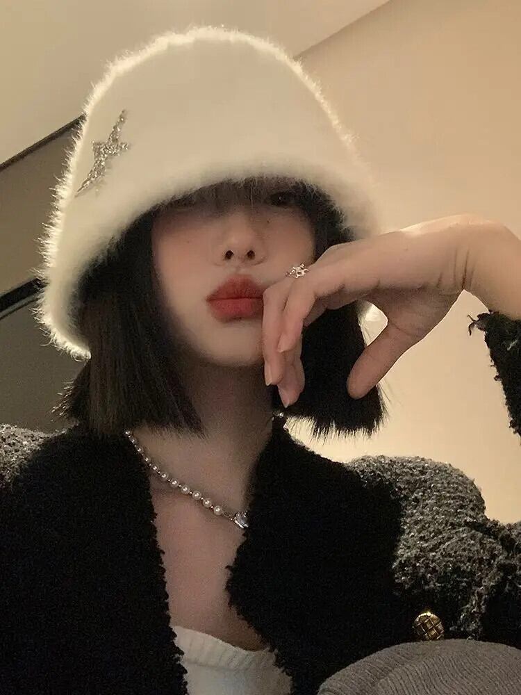 甘いホットガール白ウサギ毛バケットハット秋と冬 ese 暖かい豪華バケット帽子トレンディアクセサリー ホワイト 大人ガーリー スウィート キュート カジュアル オータム 秋物 ウィンター 冬物