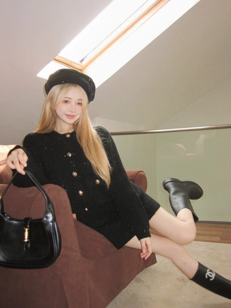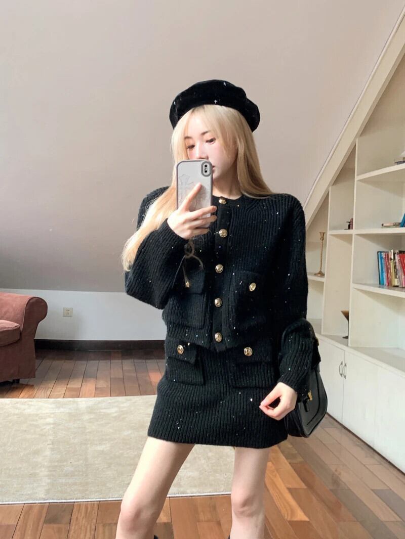 フレンチスパンコールニットスーツ秋と冬黒ニットカーディガンラップヒップショートスカートツーピースセット ブラック オータム 秋物 ウィンター 冬物