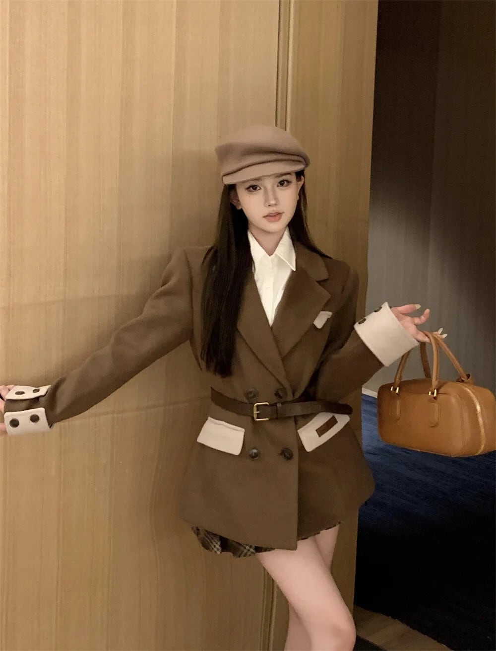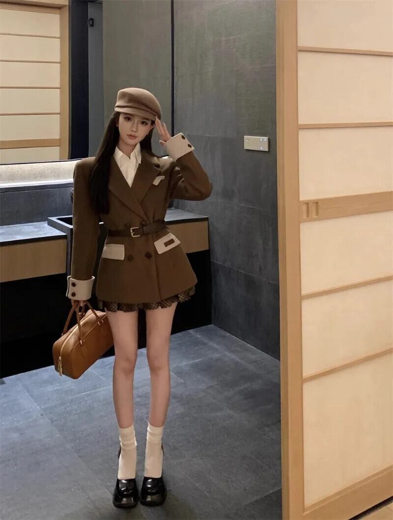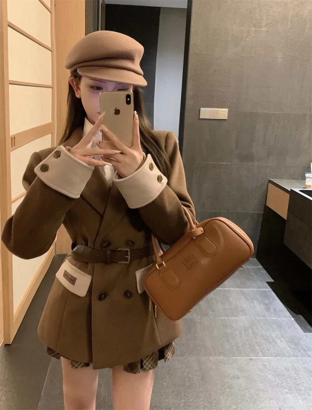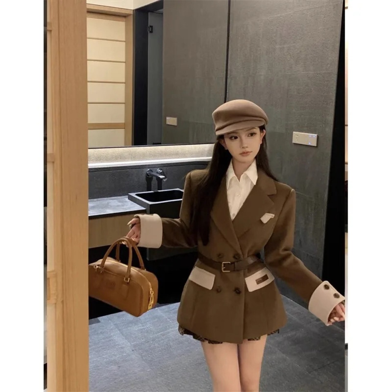 メイラードスタイルウールスーツジャケット秋と冬レトロスタイルルーズターンダウン襟ベルトコート オータム 秋物 ウィンター 冬物 ハーネス
