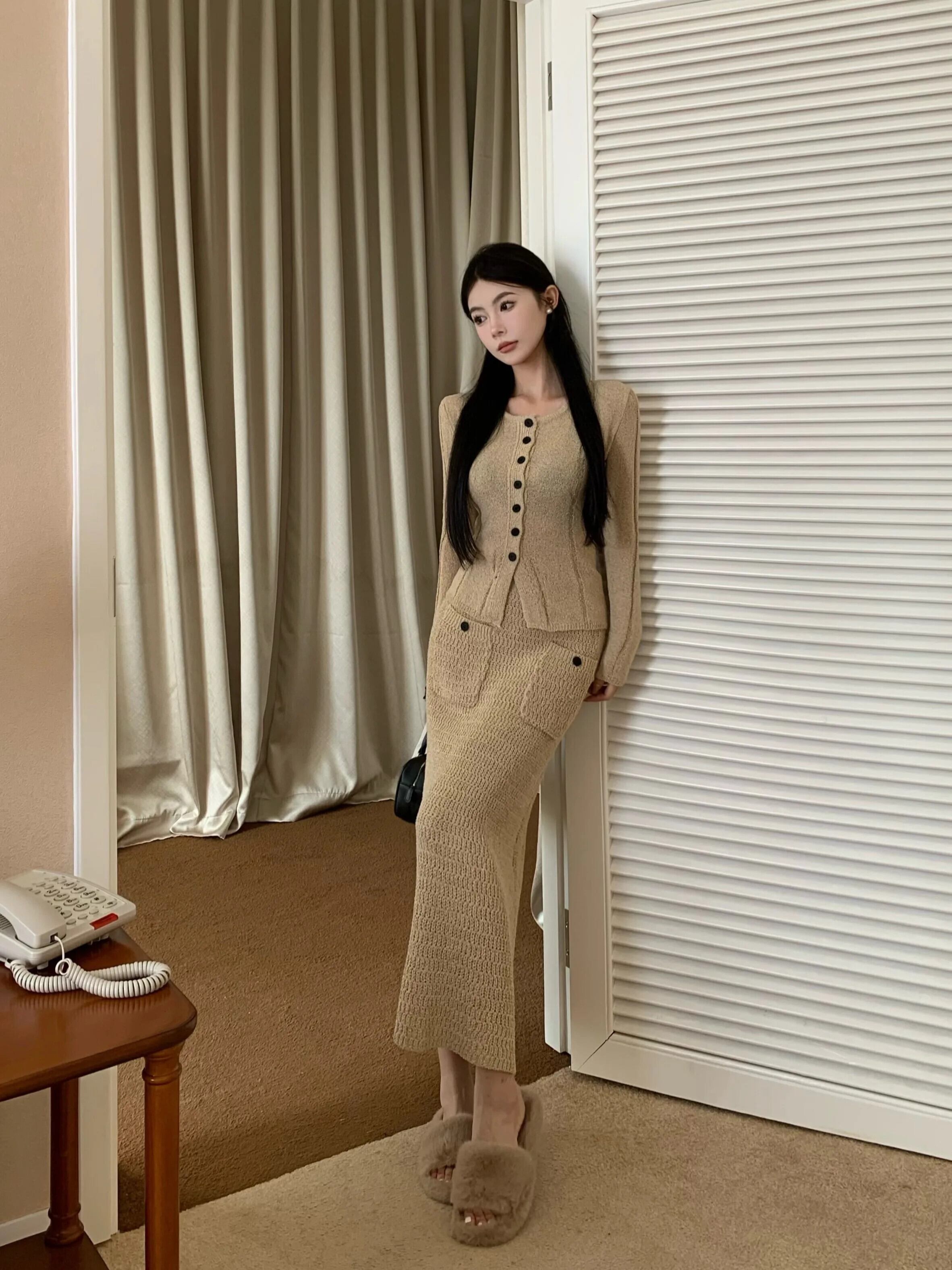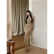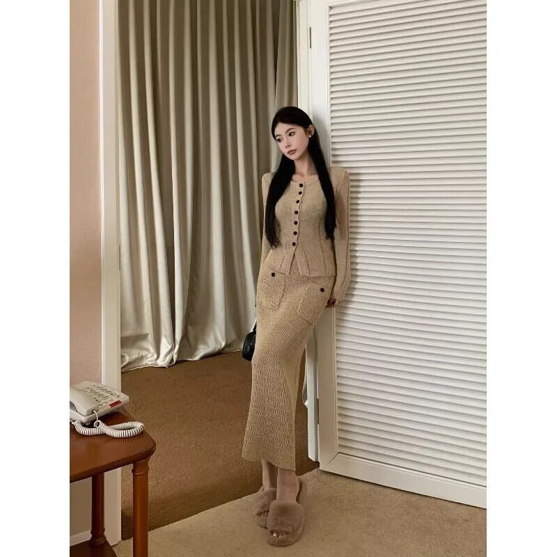 Sweet Girl スーツ レディース 冬 カーキ ニット カーディガン ウエスト ニット ヒップ ラップ ロング スカート 2 点セット 大人ガーリー スウィート キュート カジュアル ウィンター 冬物