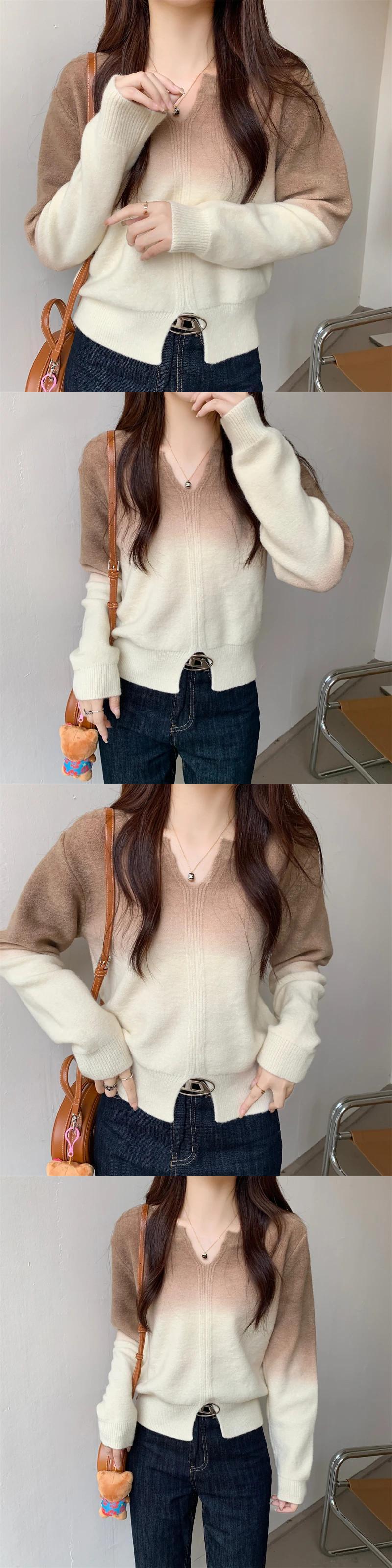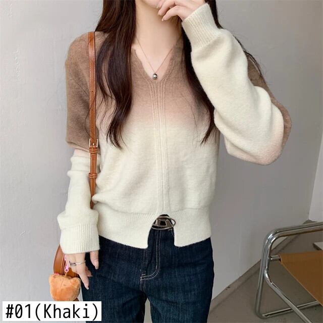 ホットガールグラデーション絞り染め V ネックニット秋/冬長袖 V ネック下敷きセーター ロング オータム 秋物 ウィンター 冬物 Vネック