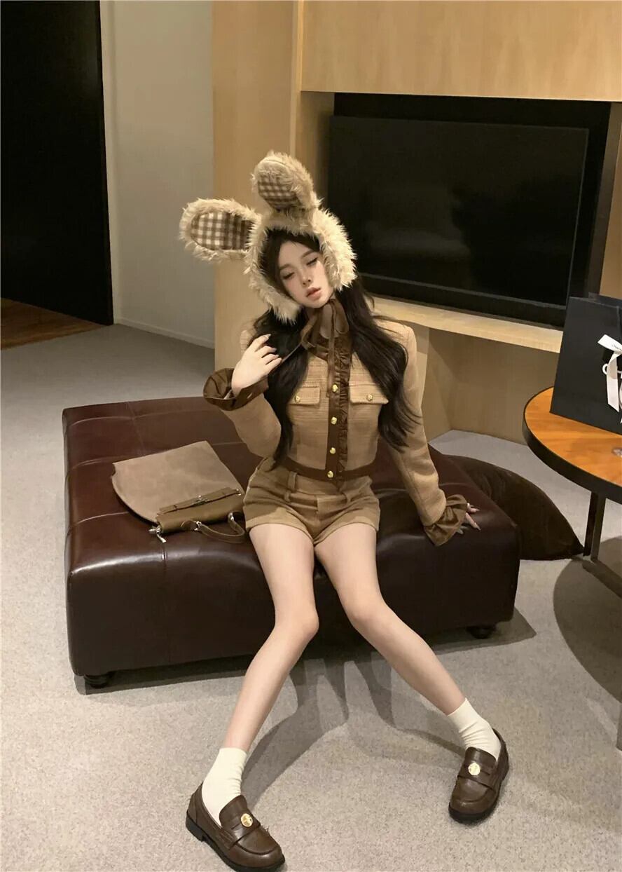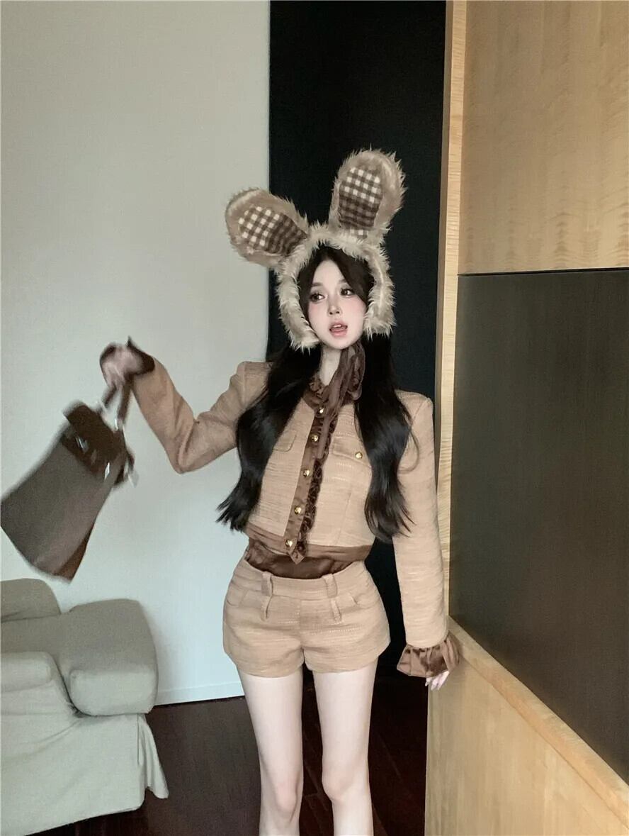 甘いホットガールレトロスーツ秋と冬フリルジャカードショートコートミニショーツ 2 点セット ラッフル 大人ガーリー スウィート キュート カジュアル オータム 秋物 ウィンター 冬物 ブルマー