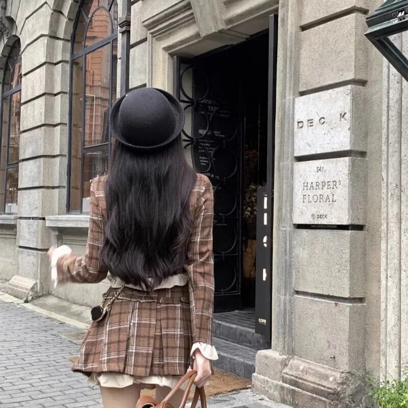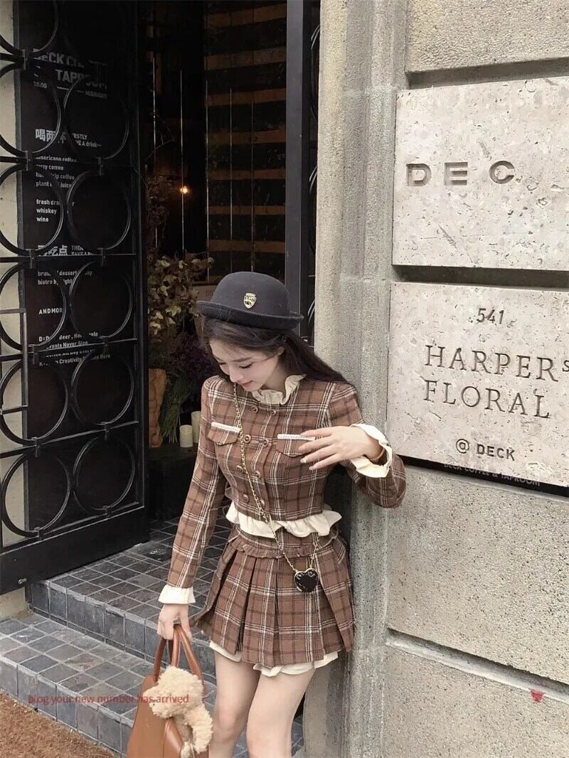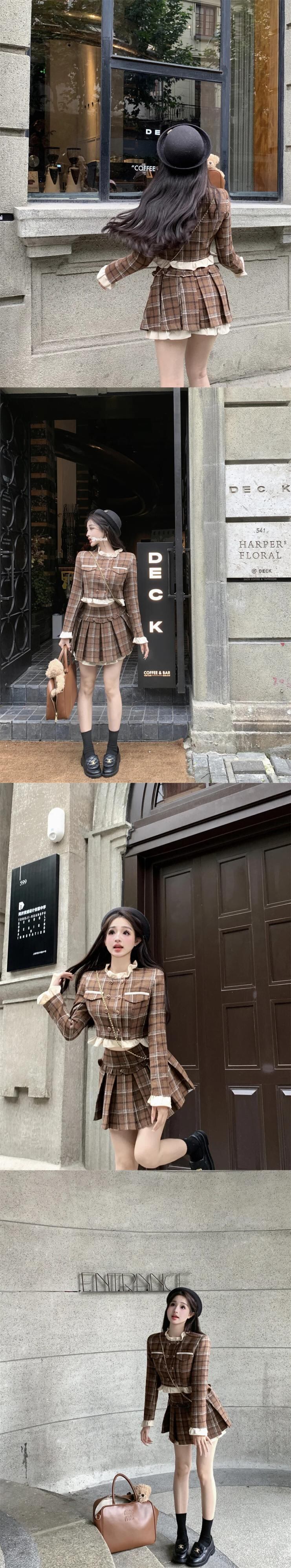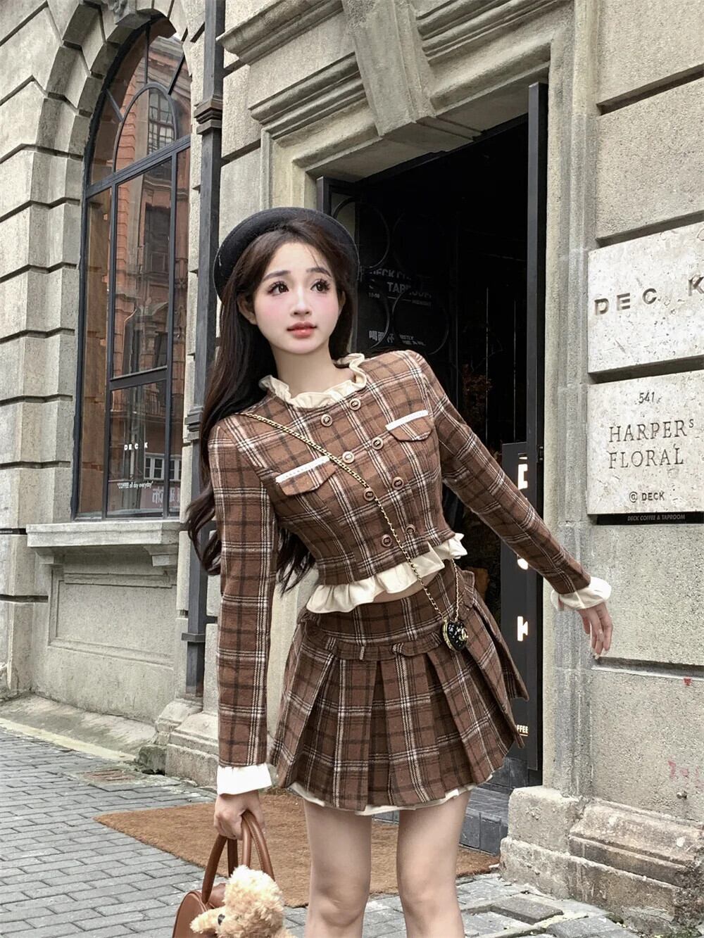 メイラード プレッピー スタイル スーツ レディース 秋チェック柄長袖ショート コート プリーツ ミニスカート 2 点セット ロング オータム 秋物