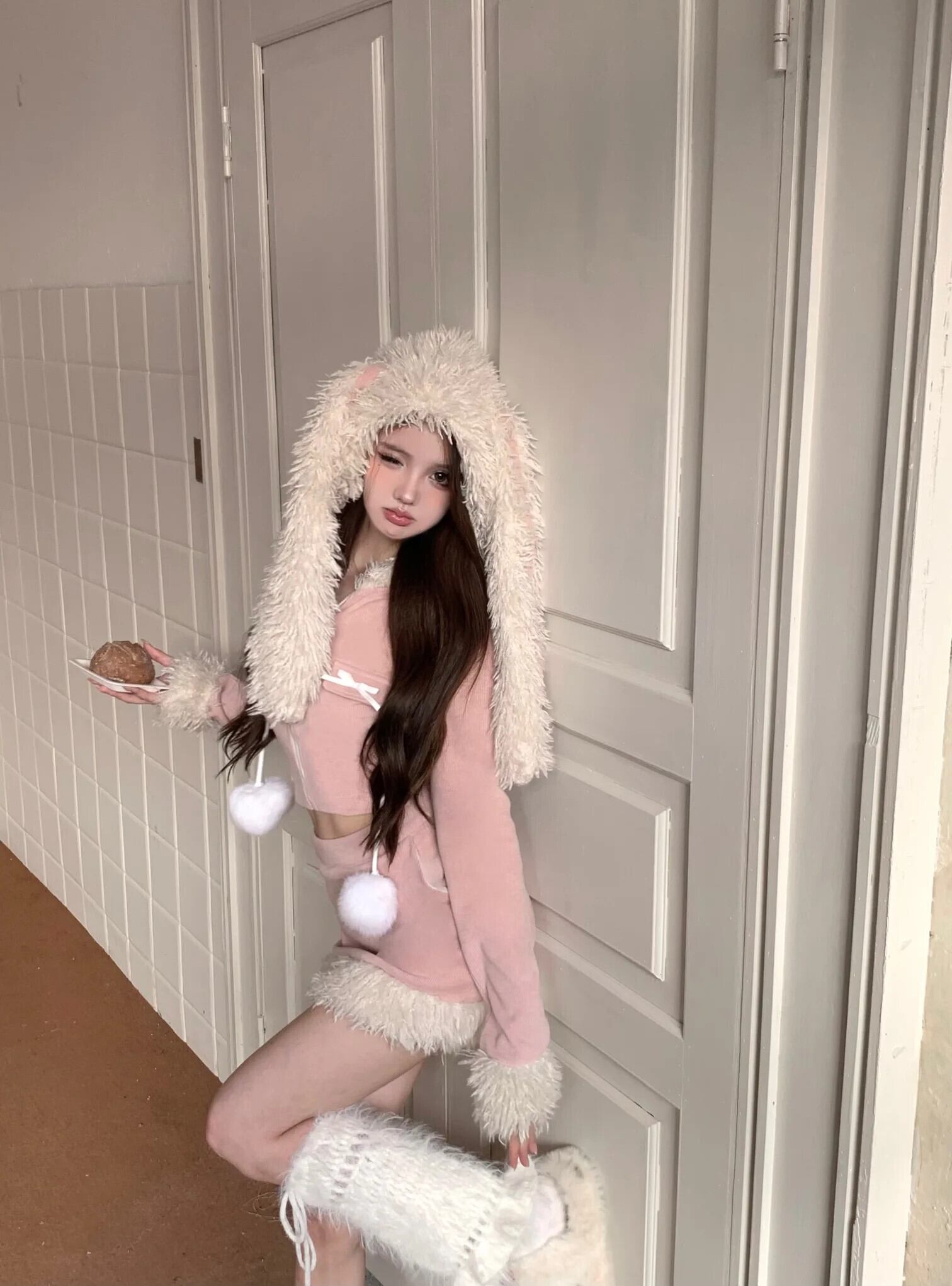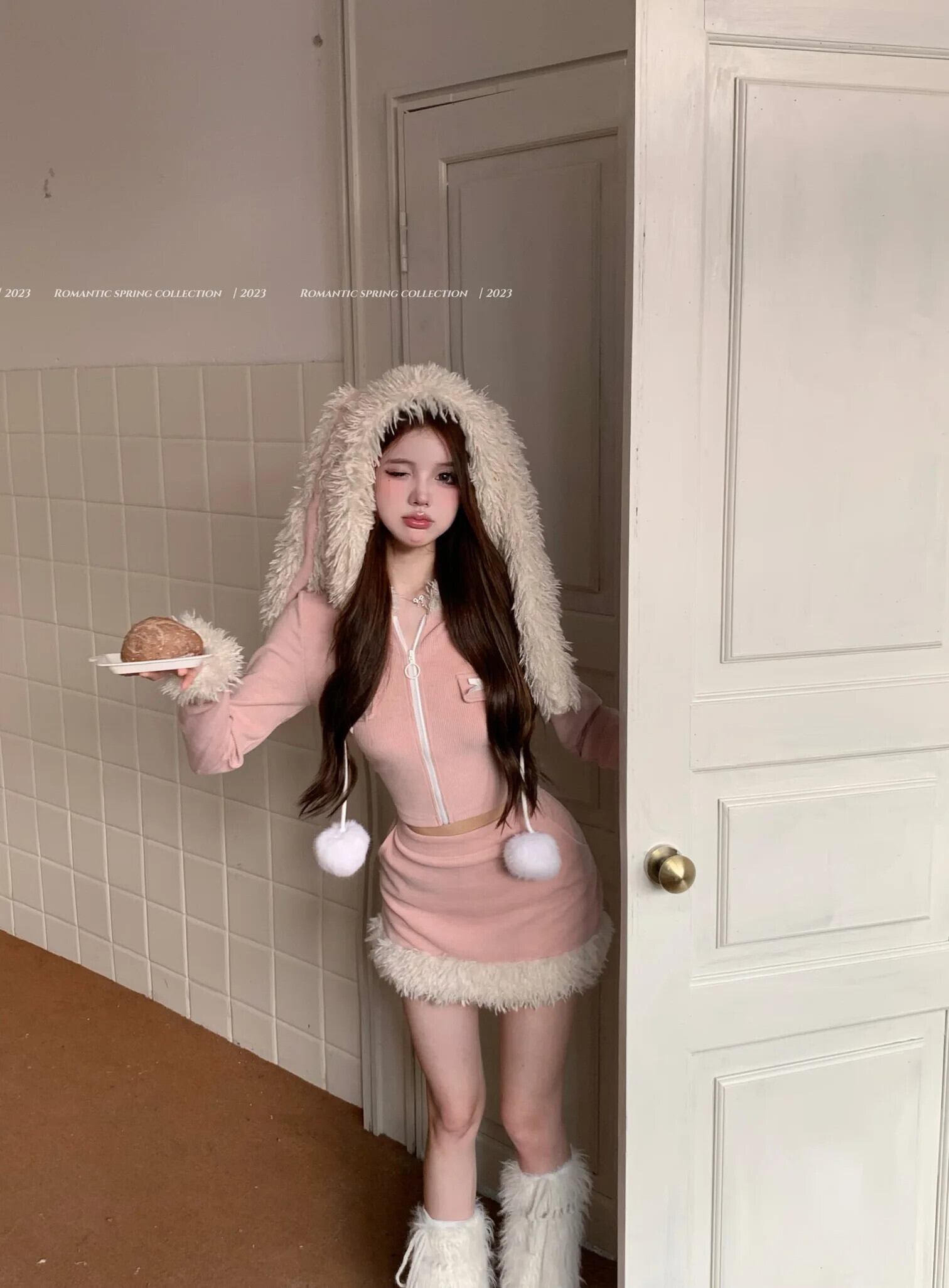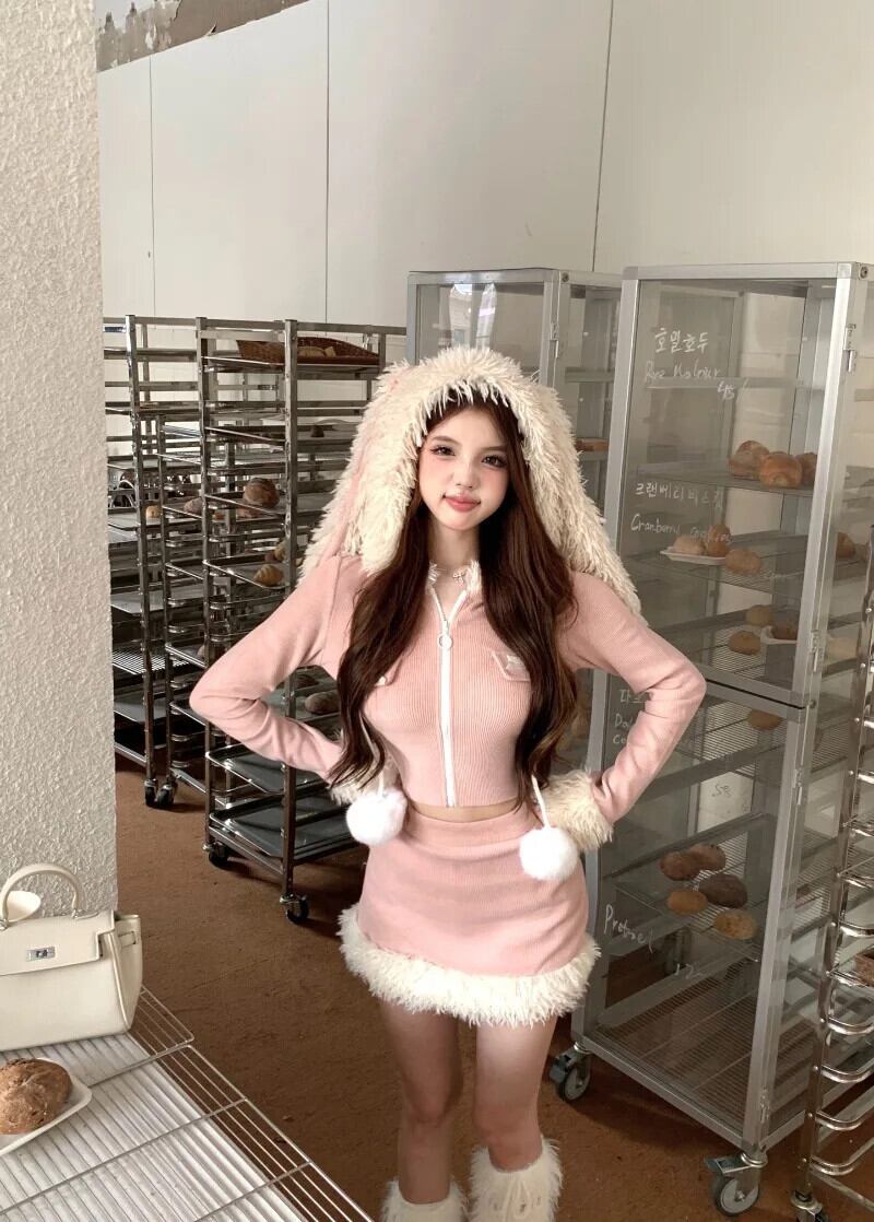 甘いホットガールスーツ秋/冬ピンクウサギ耳フード付きトップラップヒップミニスカートツーピースセット 大人ガーリー スウィート キュート カジュアル オータム 秋物 ウィンター 冬物