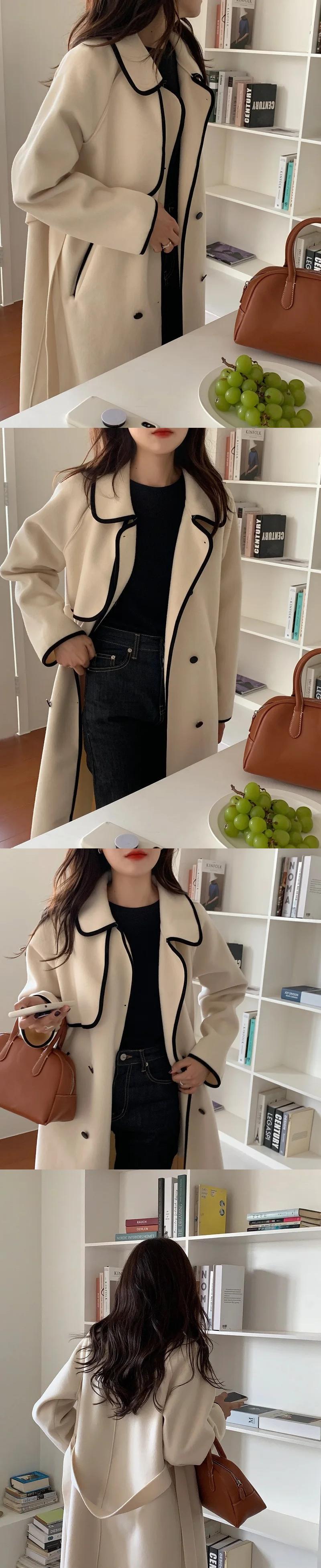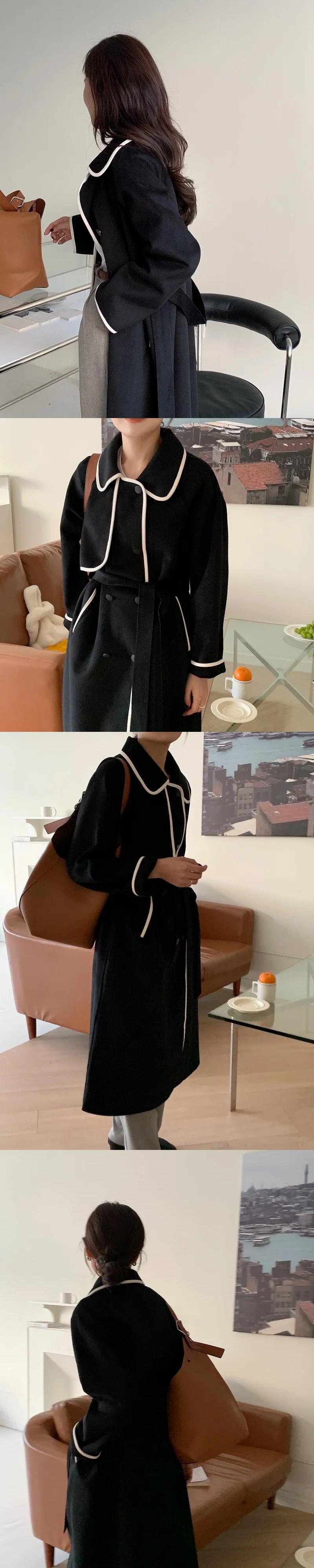 オフィスレディコントラストダブルブレストコート秋ルーズレースアップミッドレングス両面ウールコート オータム 秋物 会社 学校 通勤や通学にも