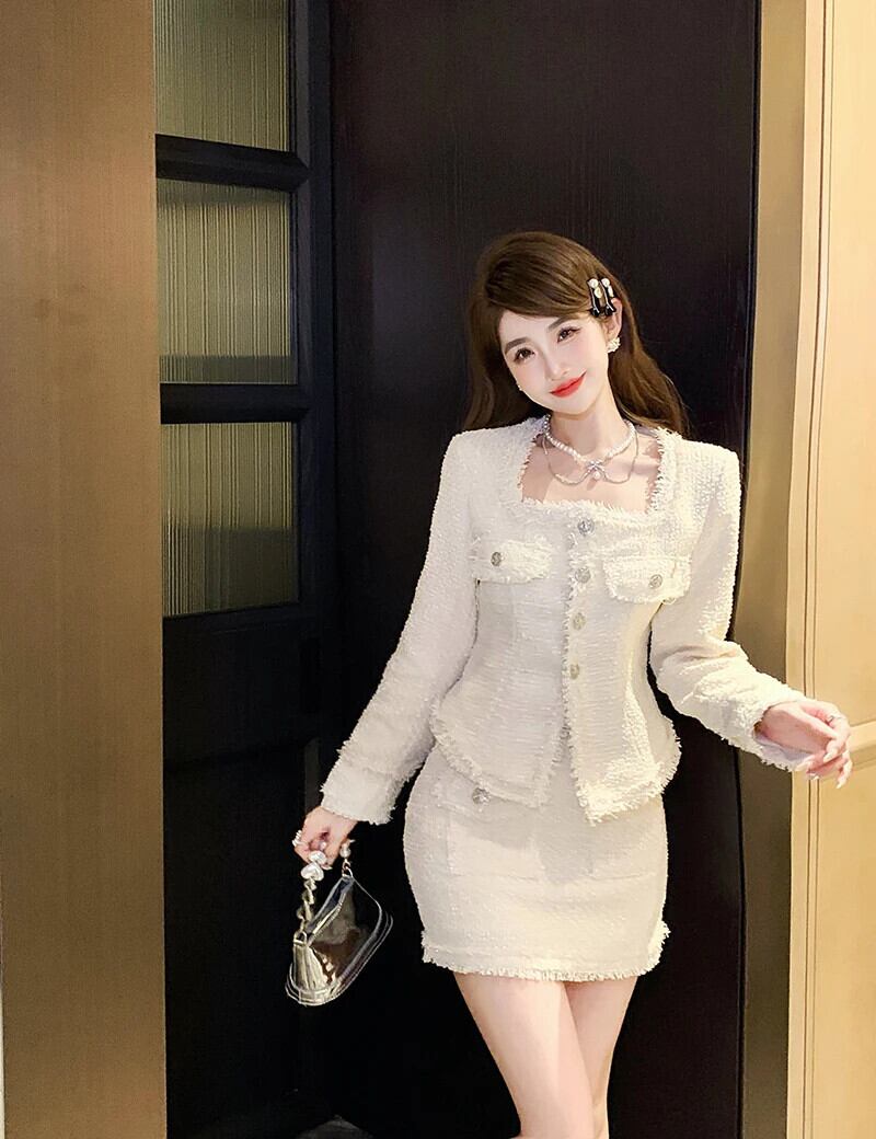 フレンチスイートガールスーツ秋スリムフィットスクエアカラーコートウエストショートスカートツーピースセット 大人ガーリー スウィート キュート カジュアル オータム 秋物 スクウェア