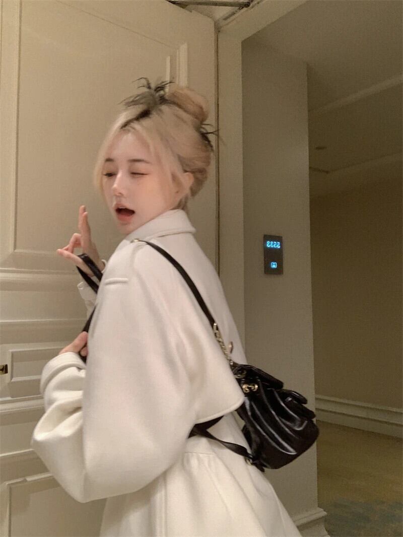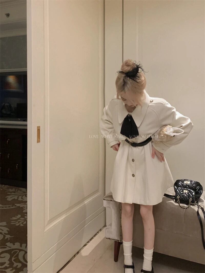 甘いホットガール白ターンダウン襟ウールケープコート冬ウエストバンドベルトロングコート ホワイト 大人ガーリー スウィート キュート カジュアル ウィンター 冬物 ハーネス