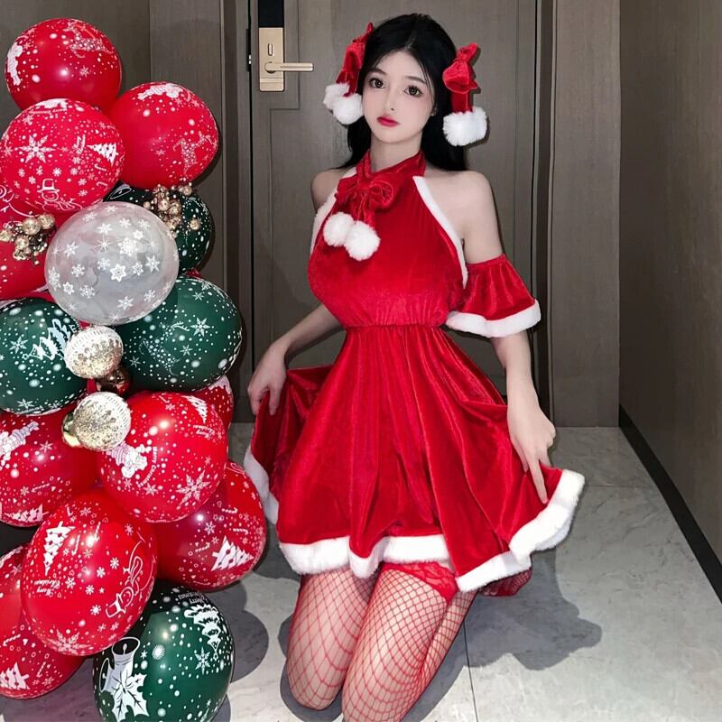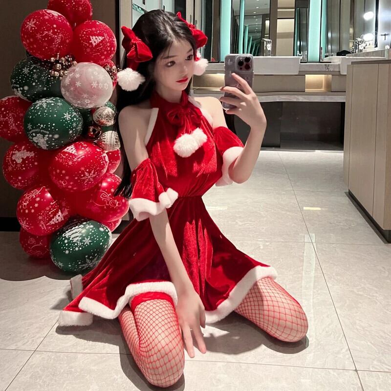 甘いホットガールクリスマスレッドかわいいセクシードレス毛皮エッジ弓ホルターネックベルベットショート A ラインドレス リボン 大人ガーリー スウィート キュート カジュアル Aライン