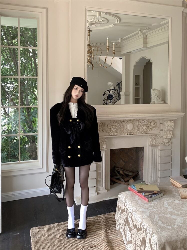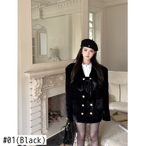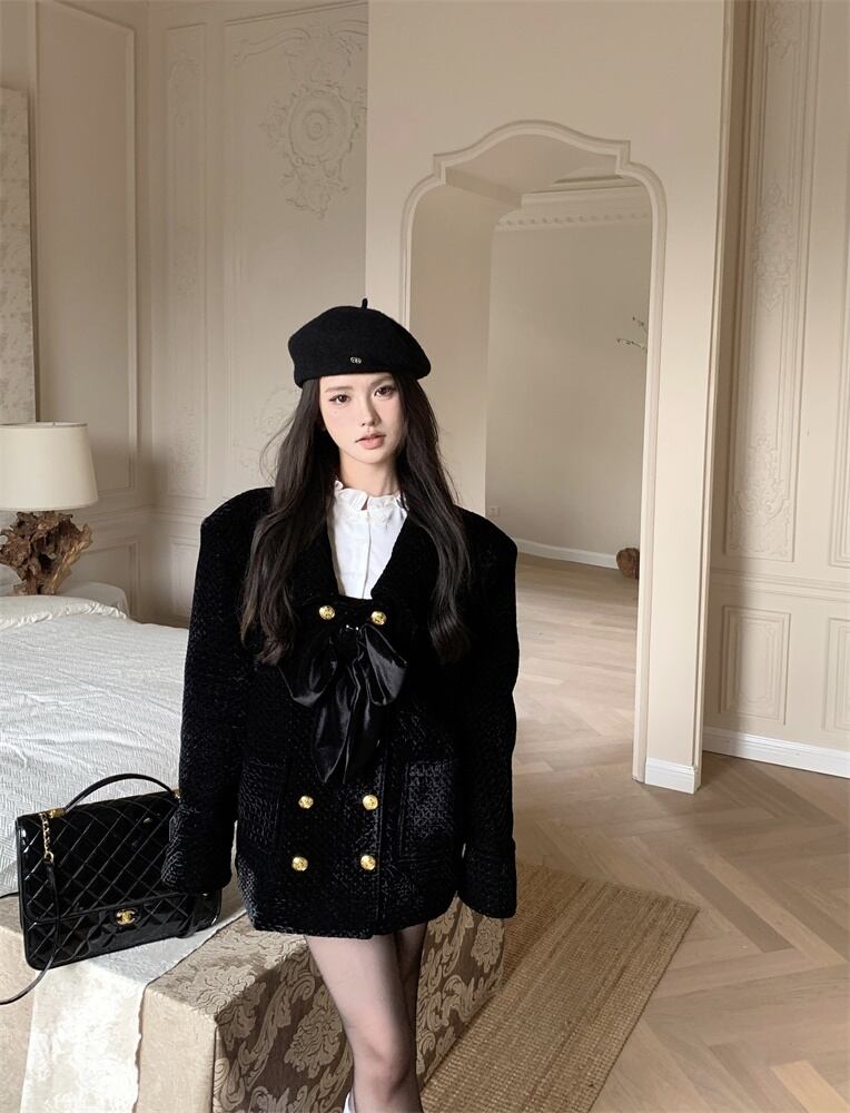 甘いホットガール弓ベルベットキルティングコート秋と冬長袖ダブルブレストルーズフィットジャケット ロング リボン 大人ガーリー スウィート キュート カジュアル オータム 秋物 ウィンター 冬物