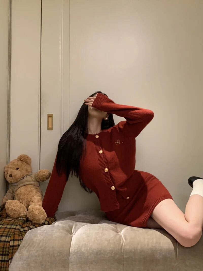 スウィートガールスーツ レディース 秋/冬 レター刺繍 レッド ニットカーディガン ラップヒップ ショートスカート ツーピースセット 大人ガーリー キュート カジュアル オータム 秋物 ウィンター 冬物