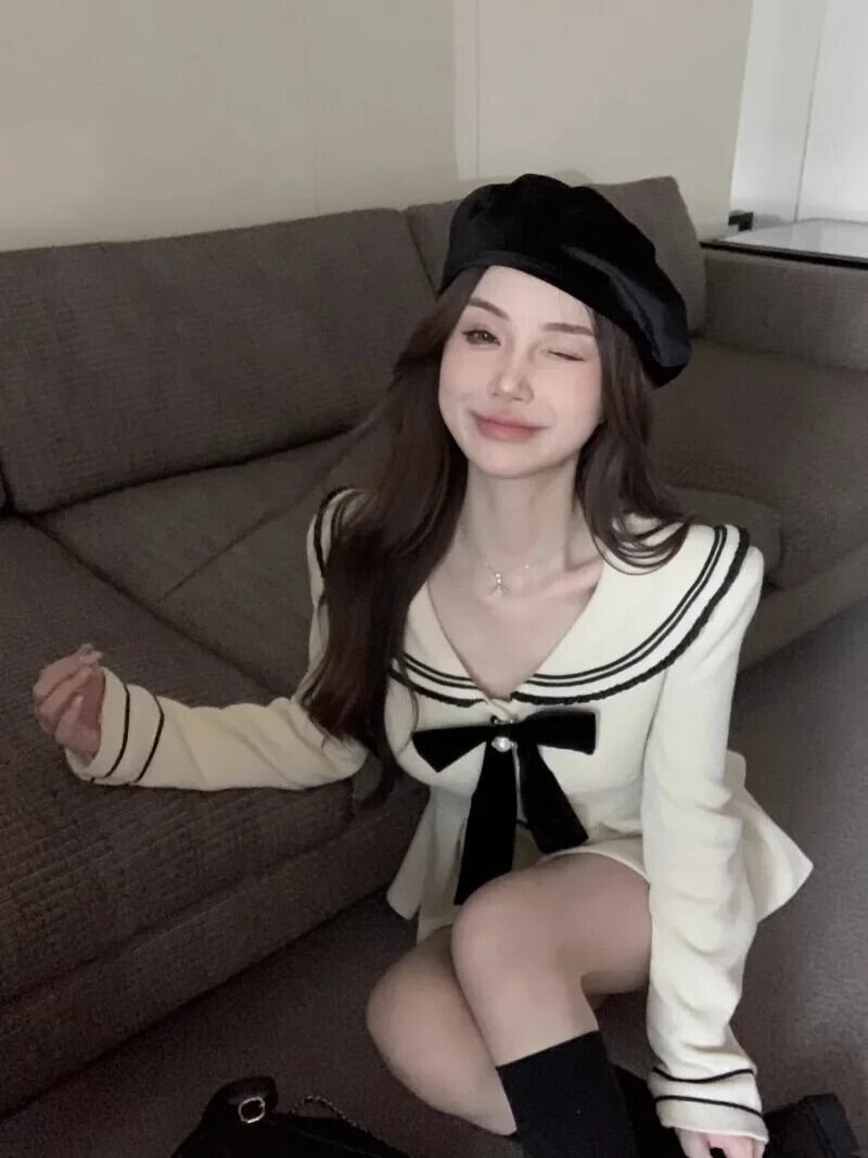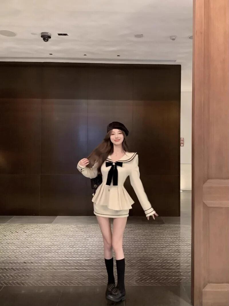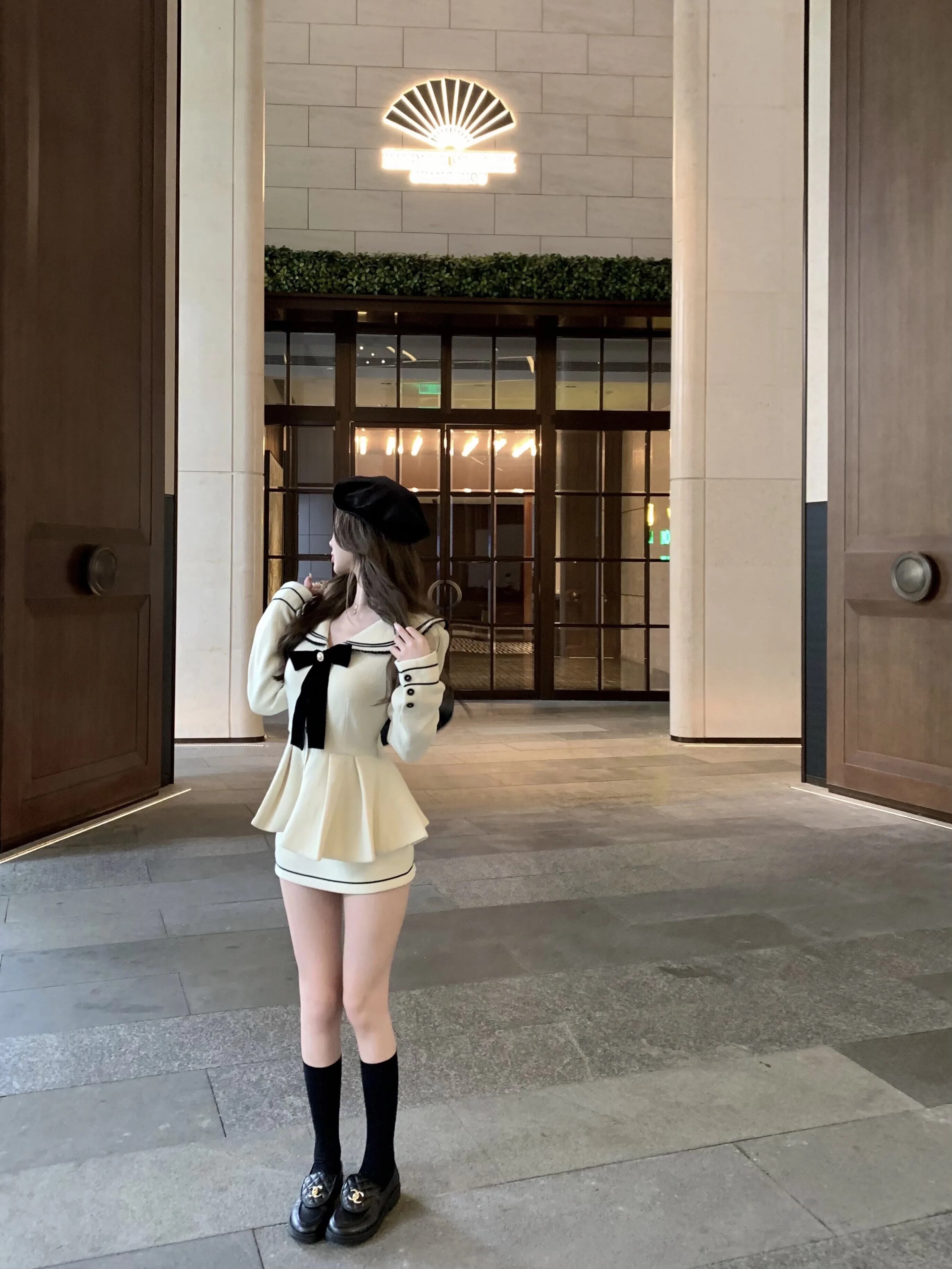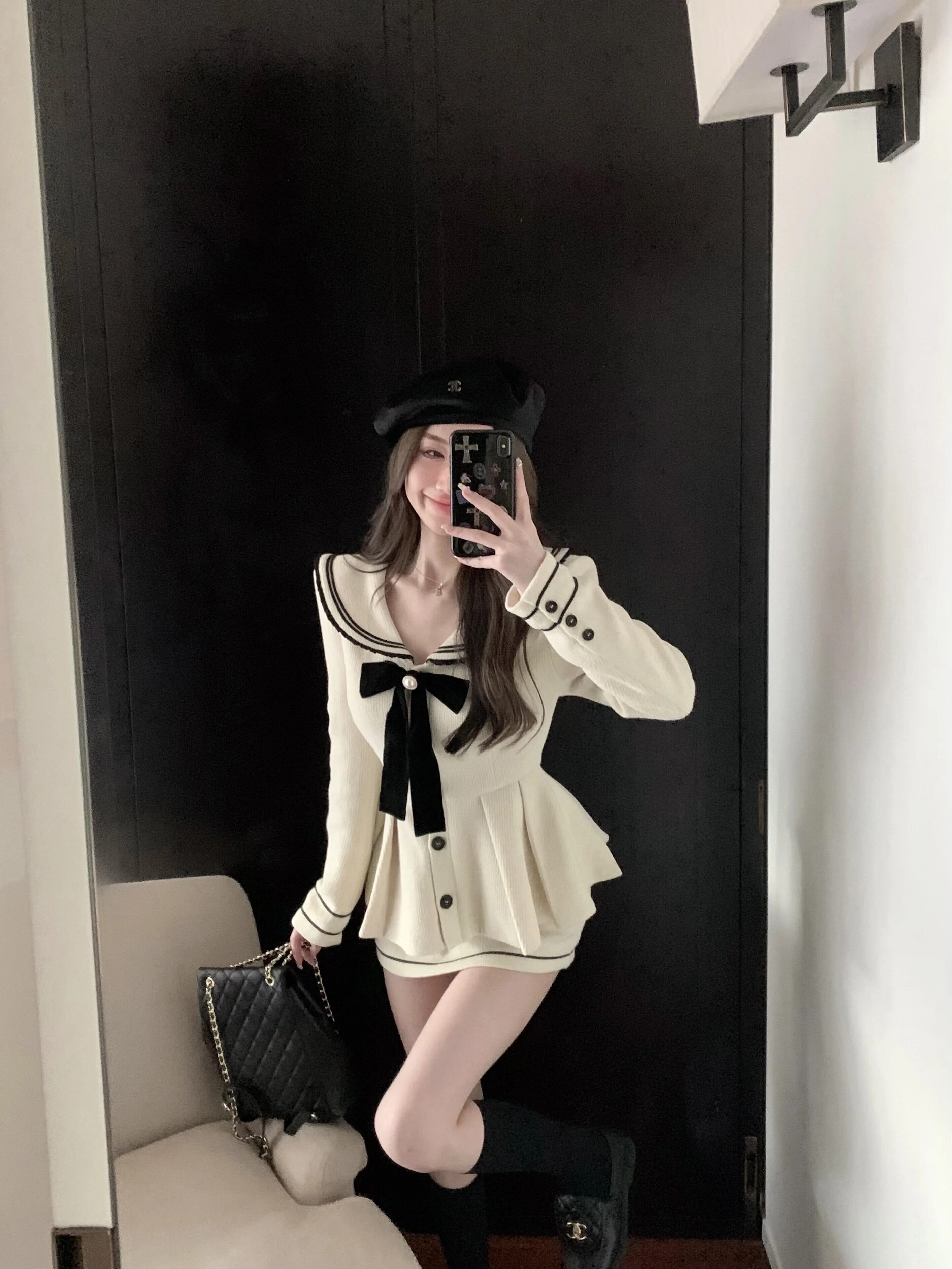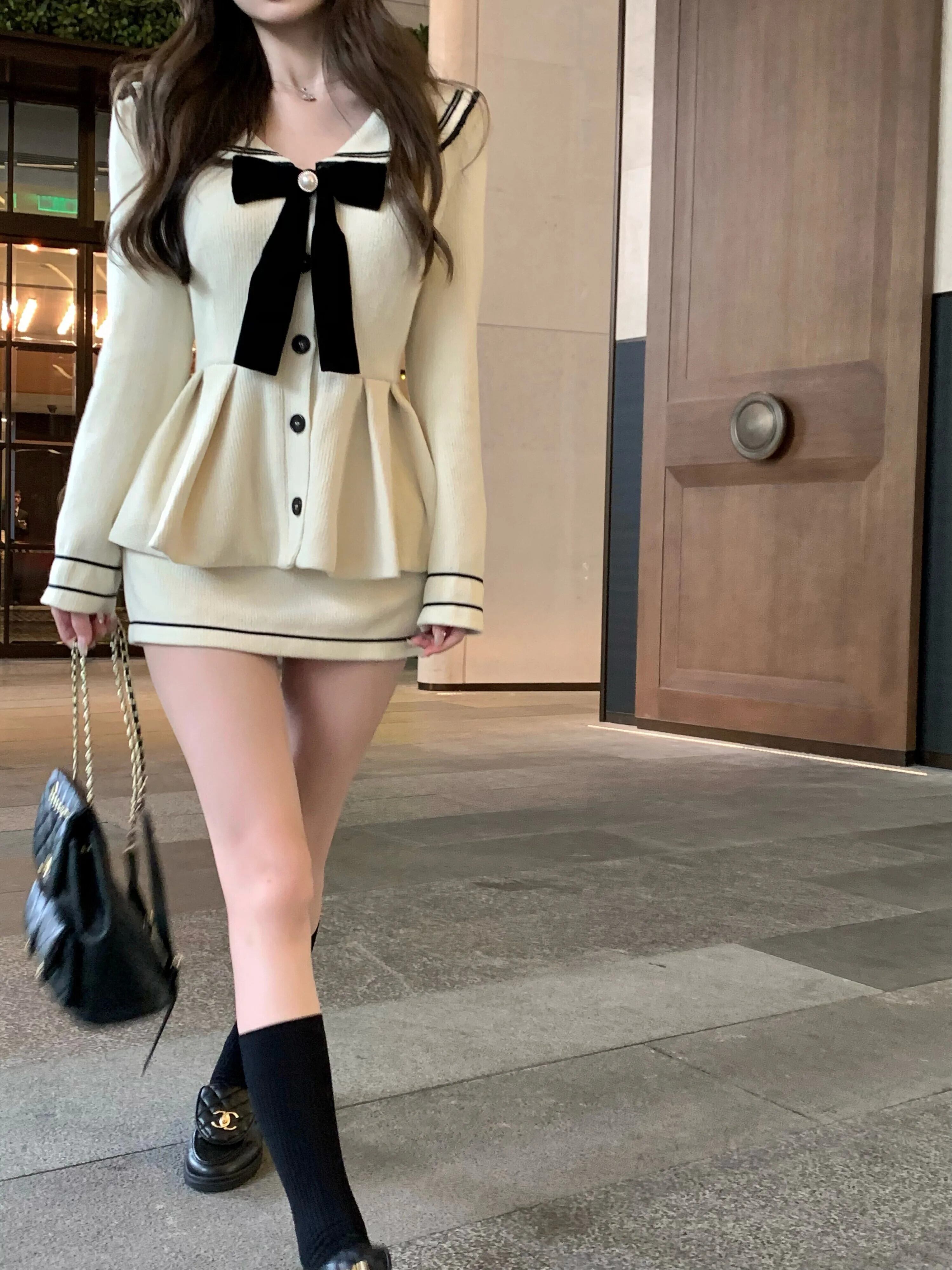 ホットガールスタイルスーツ秋セーラー襟リボンニットコートラップヒップショートスカートツーピースセット オータム 秋物