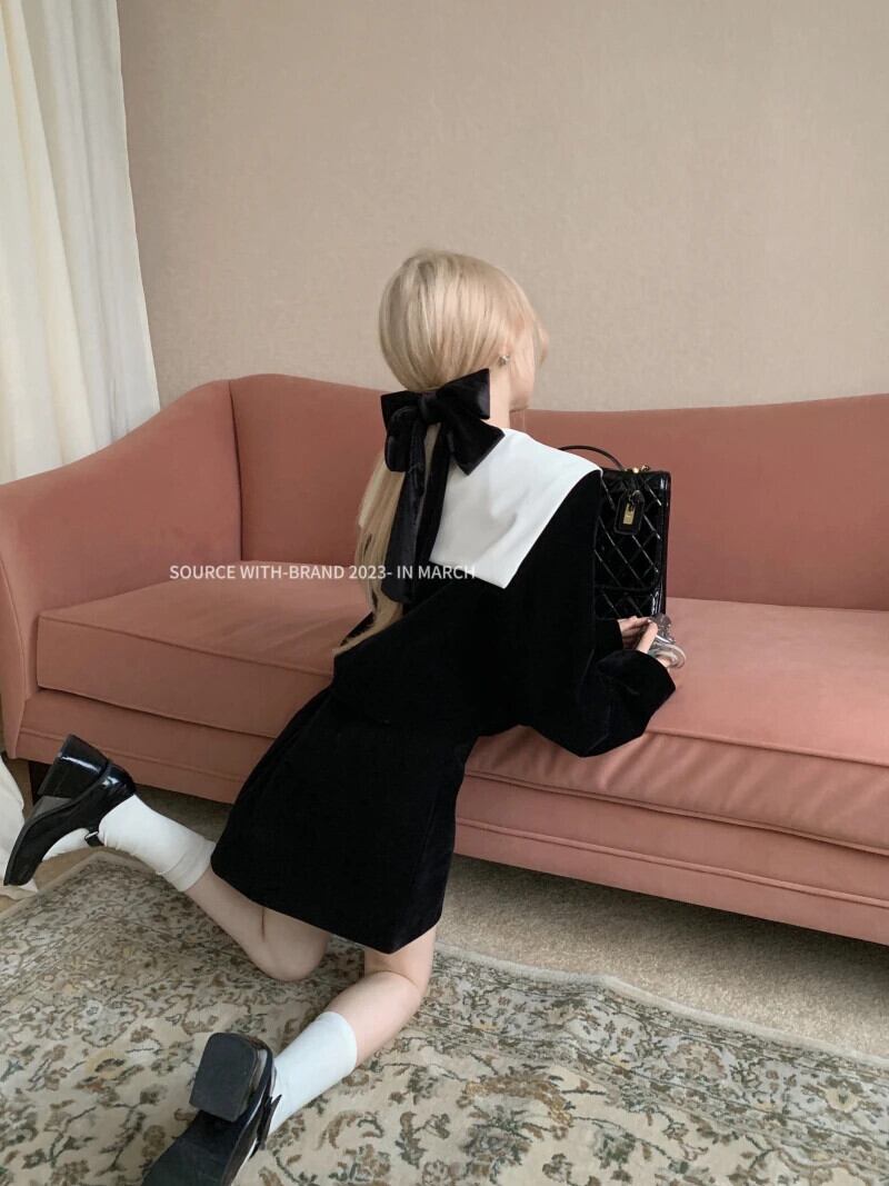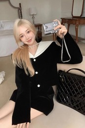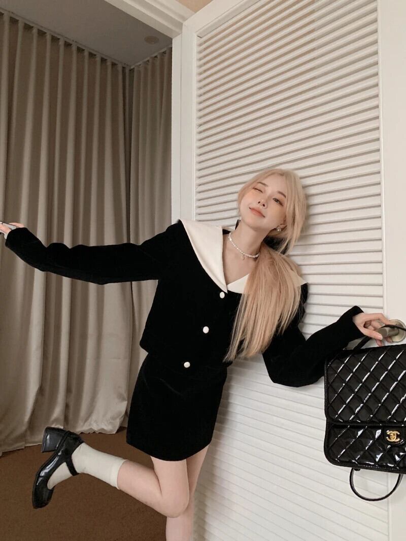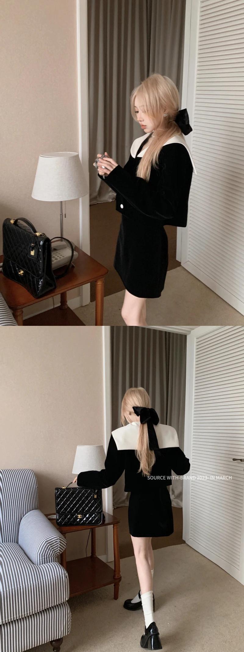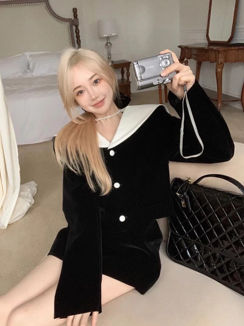 スイートガールスーツ秋/冬コントラストセーラー襟ベルベットショートコートウエストミニスカート 2 点セット 大人ガーリー スウィート キュート カジュアル オータム 秋物 ウィンター 冬物