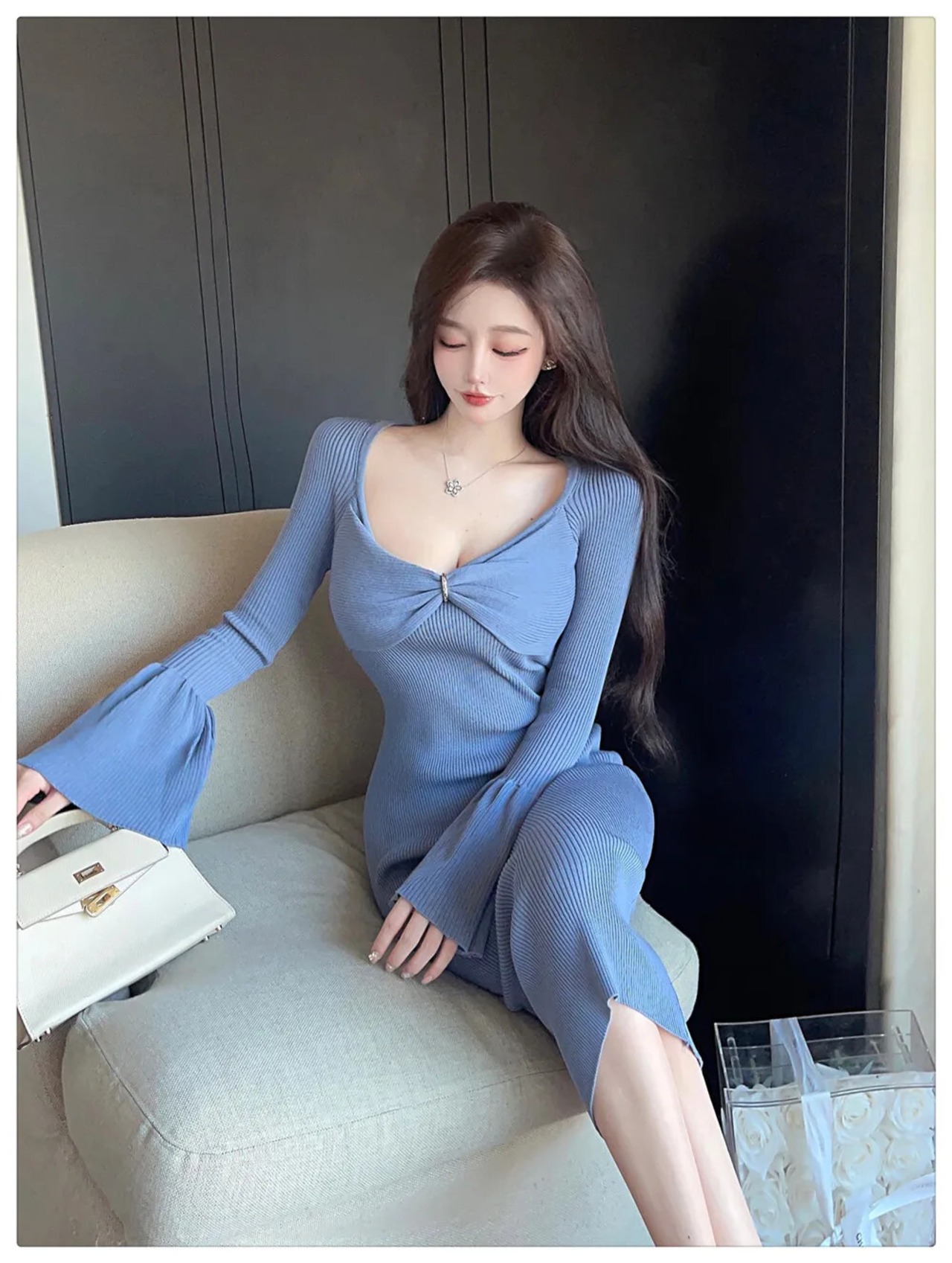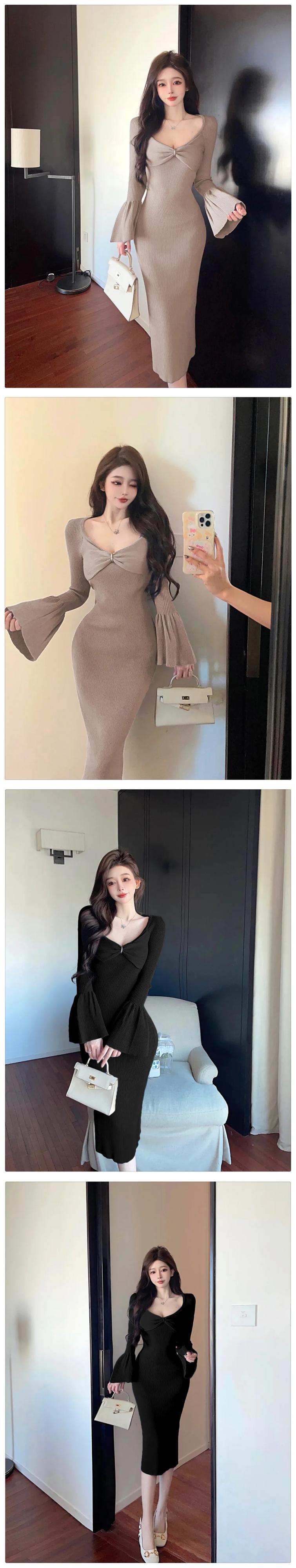 フレンチホットガールフレアスリーブセクシーニットドレス秋/冬ミッドレングススクエアカラースリムフィットドレス オータム 秋物 ウィンター 冬物 スクウェア