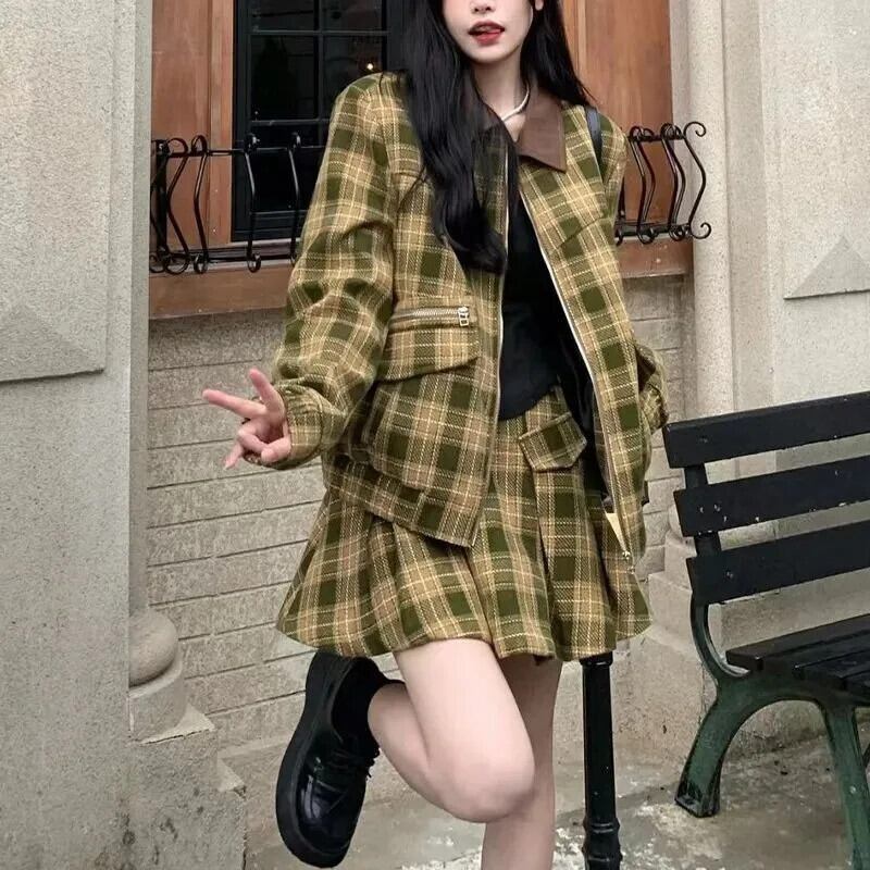 スイートガールスーツ春と秋レトロチェック柄パッチワークジャケットプリーツスカートツーピースセット 大人ガーリー スウィート キュート カジュアル スプリング 春物 オータム 秋物