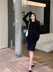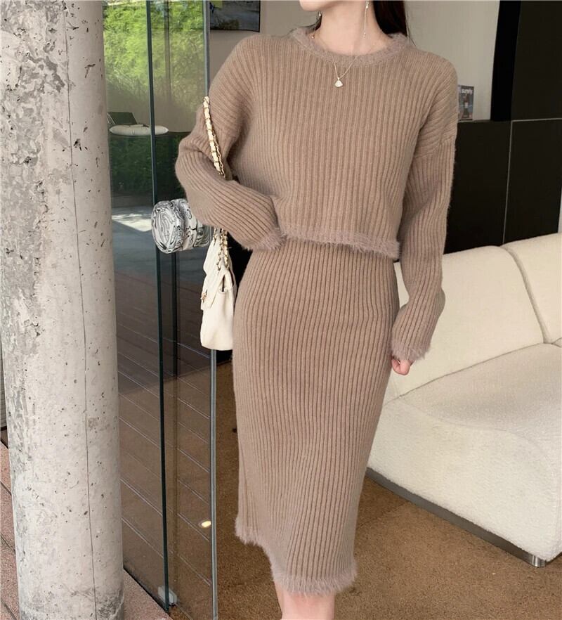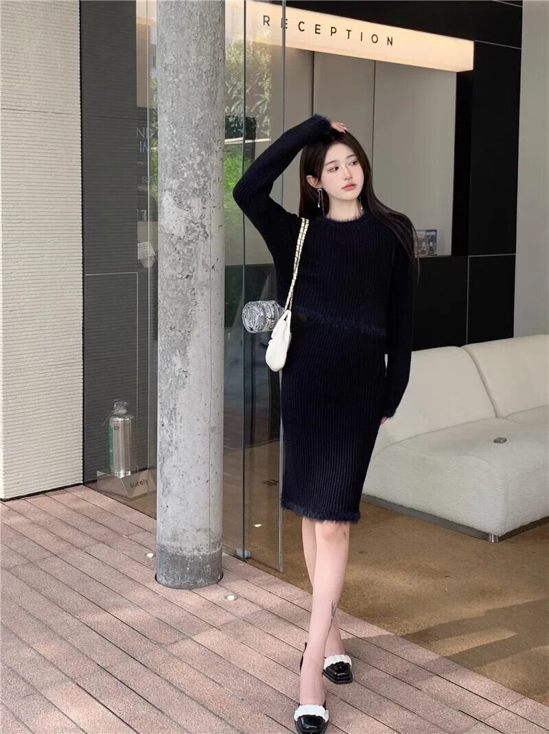 フレンチスタイルスーツ秋長袖ニットセータースリムフィットウエストロングスカートツーピースセット オータム 秋物