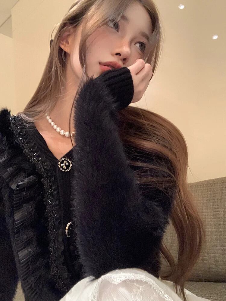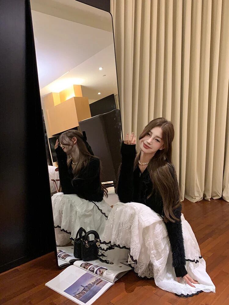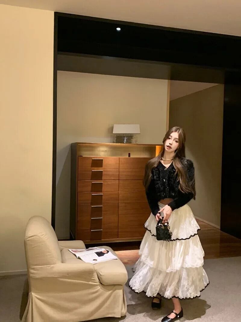 スイートホットガールスーツ レディース 秋冬 Vネック スプライスニットカーディガン ウエスト Aライン プリーツケーキスカート 2点セット 大人ガーリー スウィート キュート カジュアル オータム 秋物 ウィンター 冬物