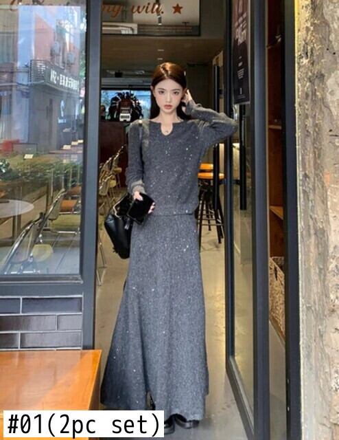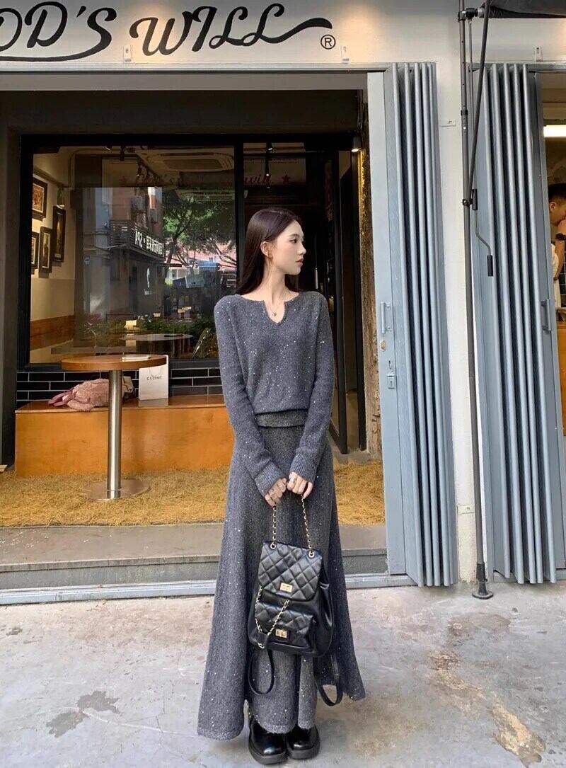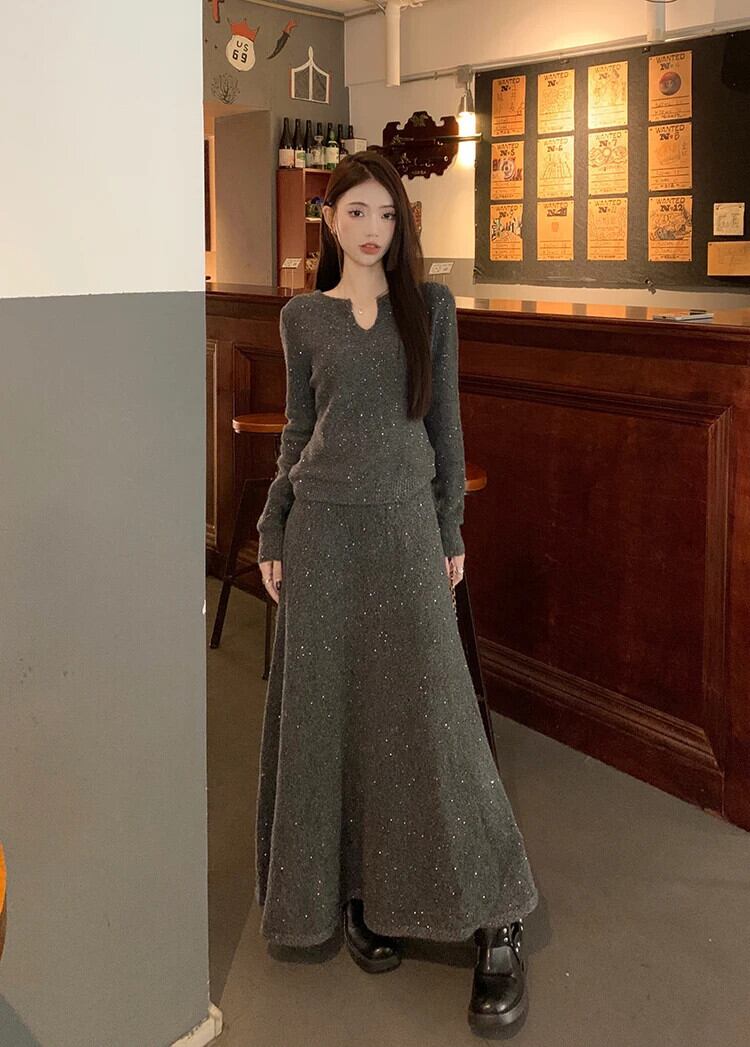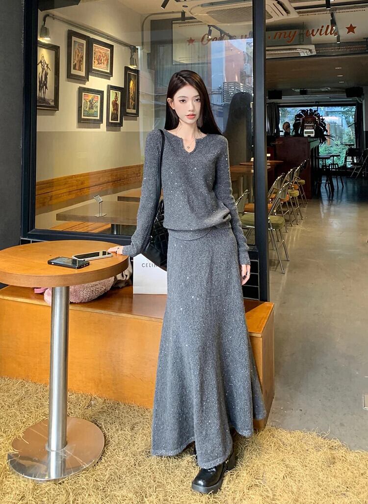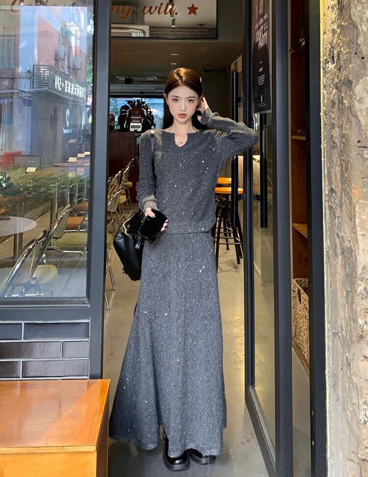 Sweet Girl スーツ レディース 秋冬 スパンコール グレー 長袖ニット ロングスカート 2点セット 大人ガーリー スウィート キュート カジュアル オータム 秋物 ウィンター 冬物