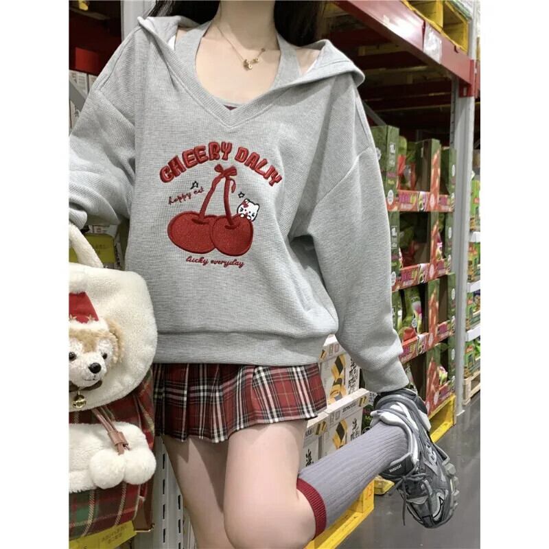 スイートホットガールスーツ秋チェリーホルタートップ刺繍フード付きスウェットシャツウエストチェック柄プリーツスカート 3 点セット 大人ガーリー スウィート キュート カジュアル オータム 秋物