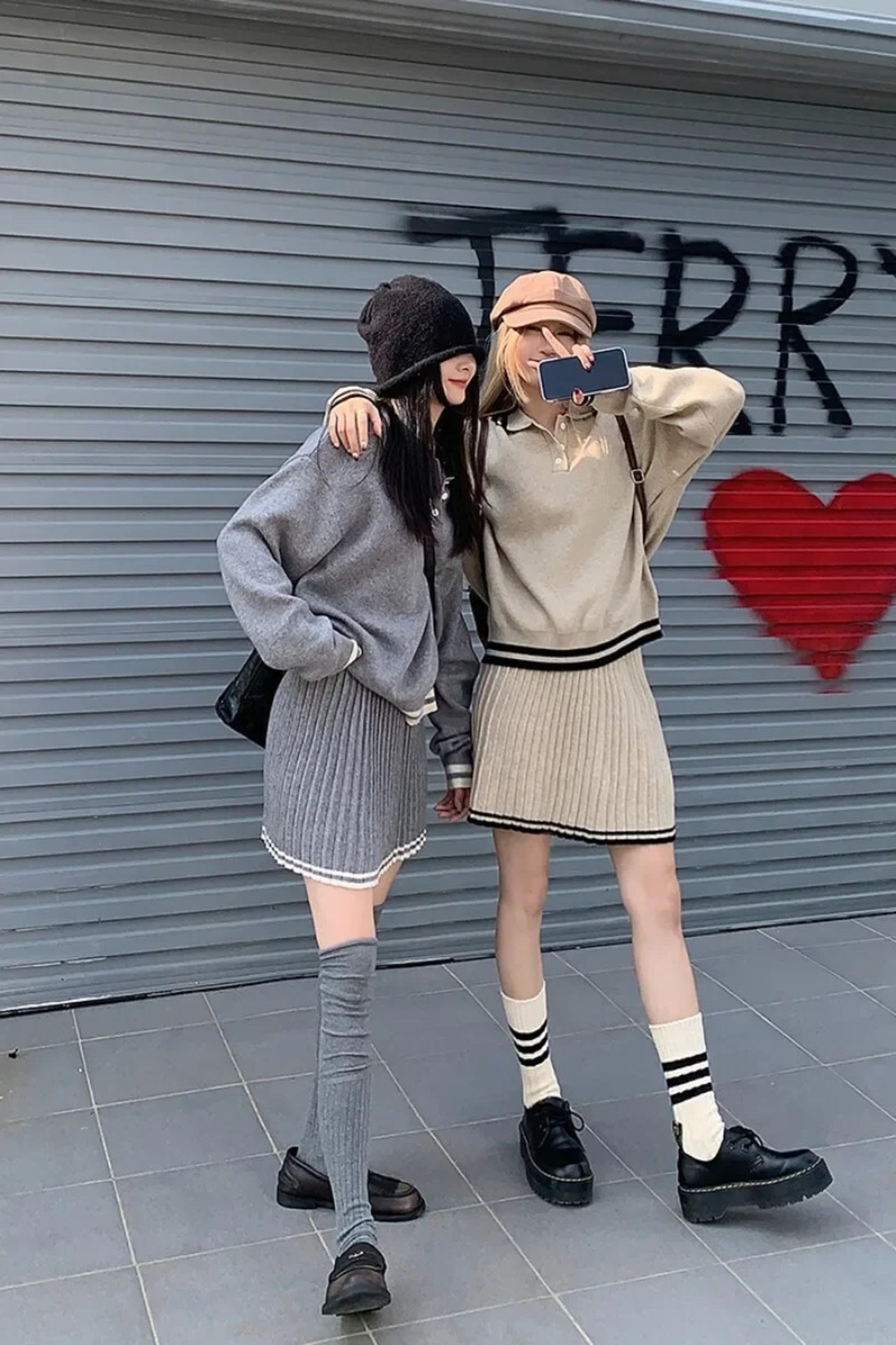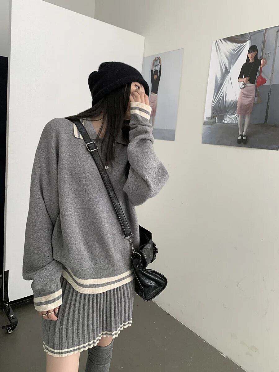 Sweet Girl ニットスーツ レディース 秋冬 ルーズ ポロネック セーター プリーツ ミニスカート 2点セット 大人ガーリー スウィート キュート カジュアル オータム 秋物 ウィンター 冬物 Oネック
