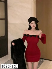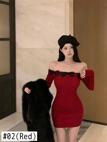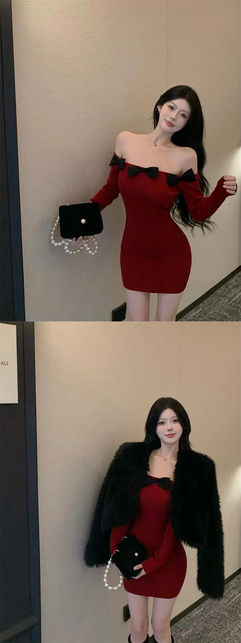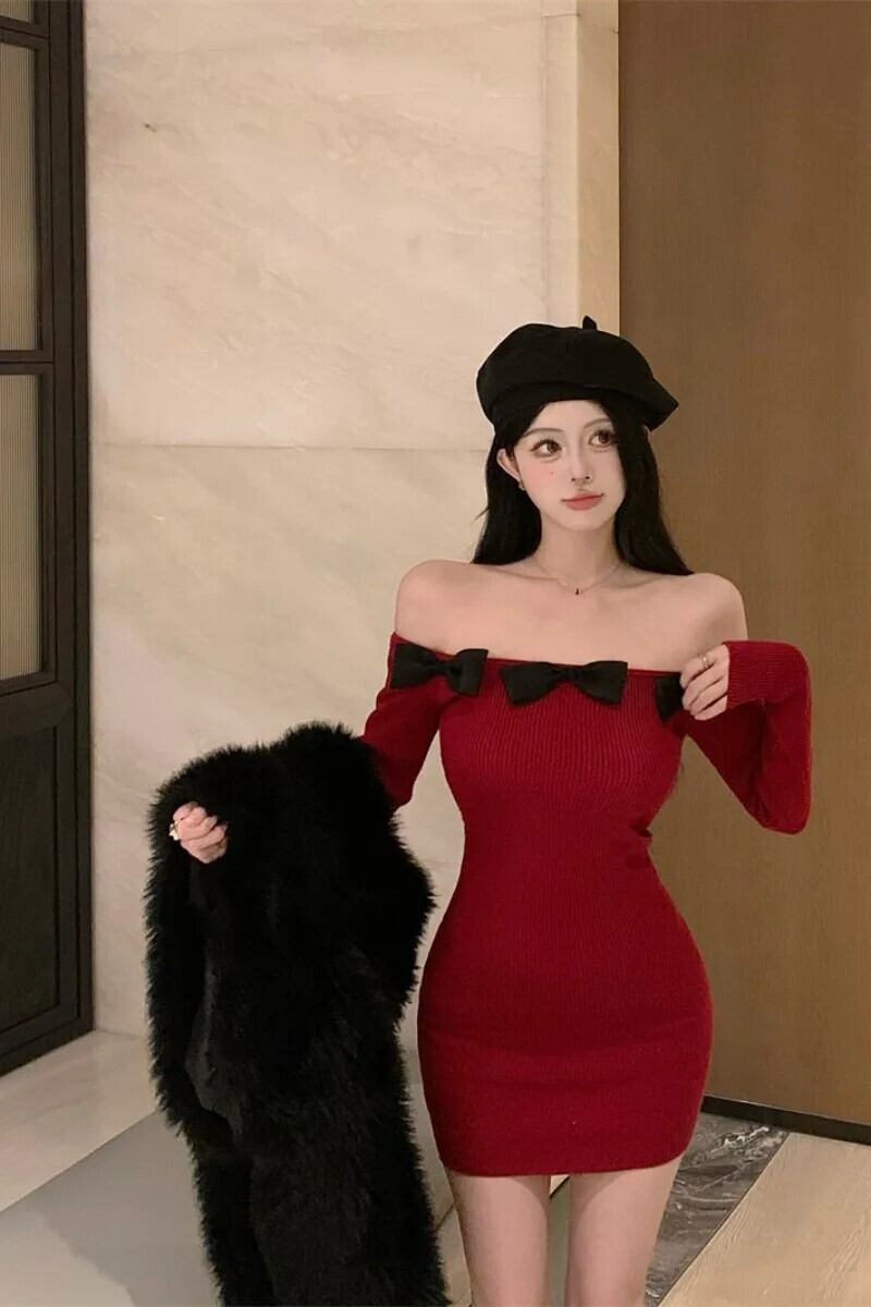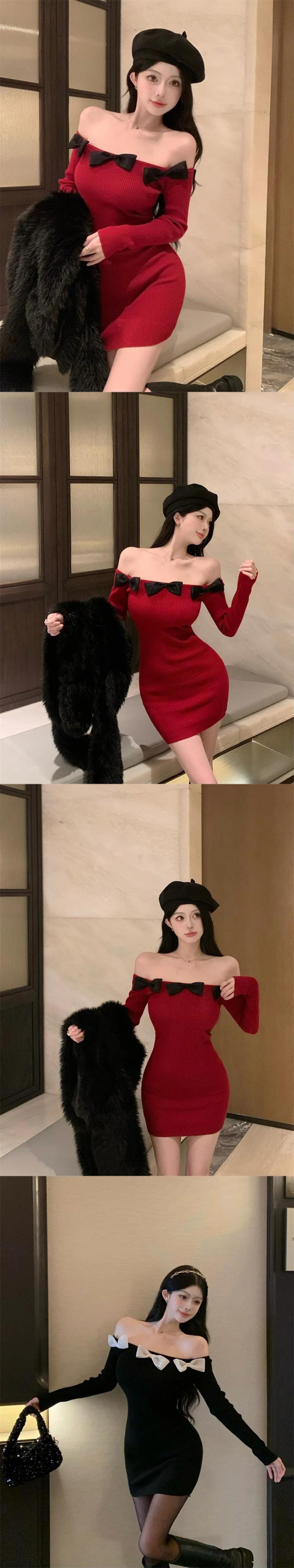 甘いホットガール純粋セクシー弓オフショルダードレススリムスラッシュネック長袖ニットショートドレス ロング リボン 大人ガーリー スウィート キュート カジュアル ピュア
