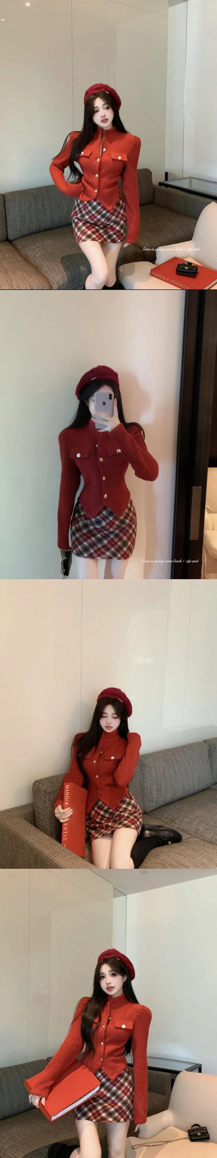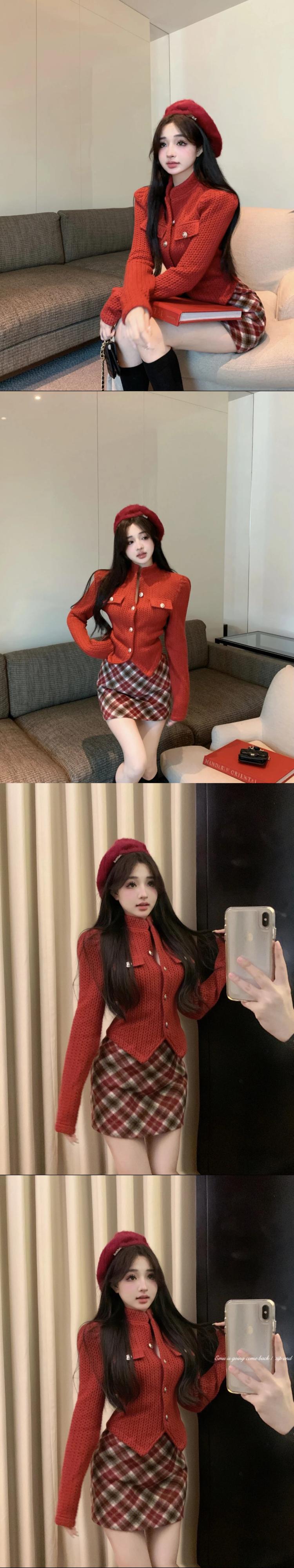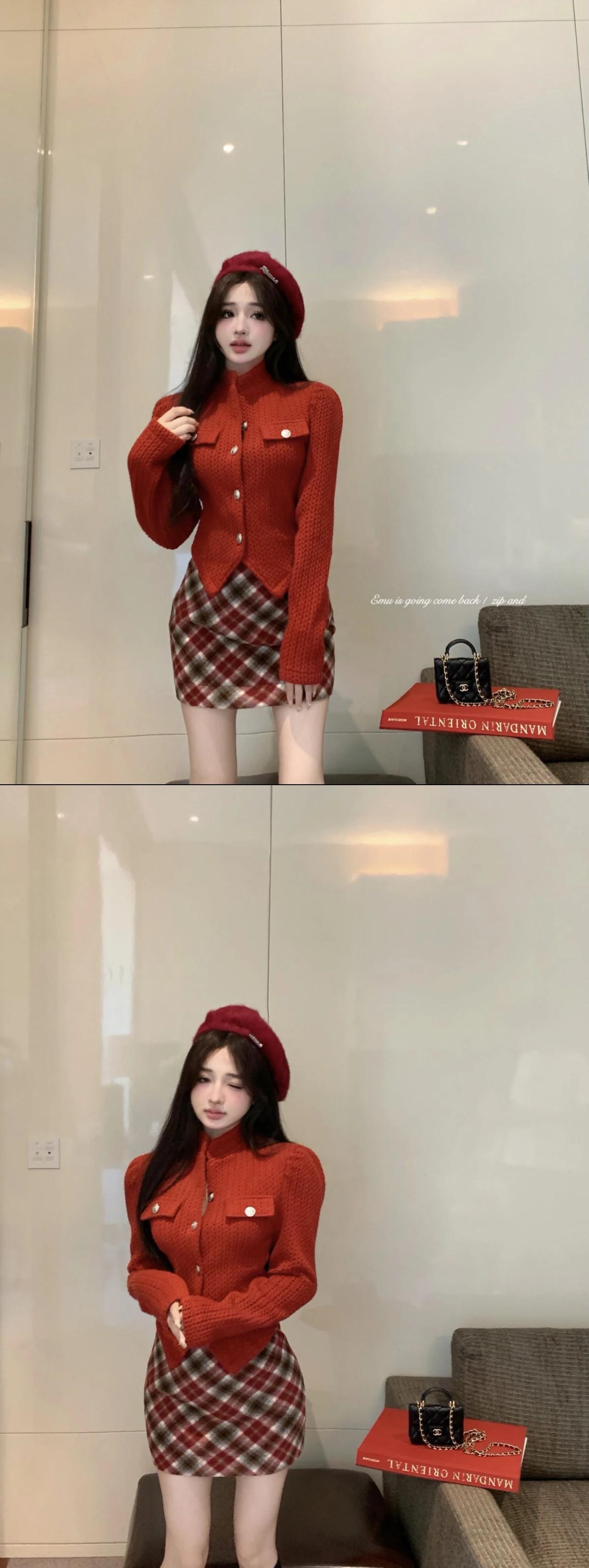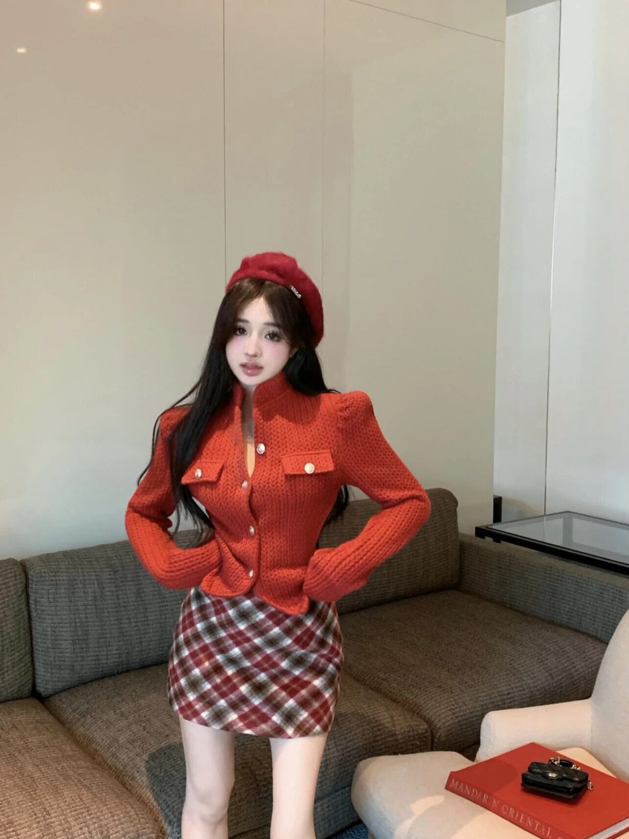 ホットガールレッドクリスマススーツ秋スリムフィットショートニットカーディガンウエストミニチェック柄スカートツーピースセット オータム 秋物