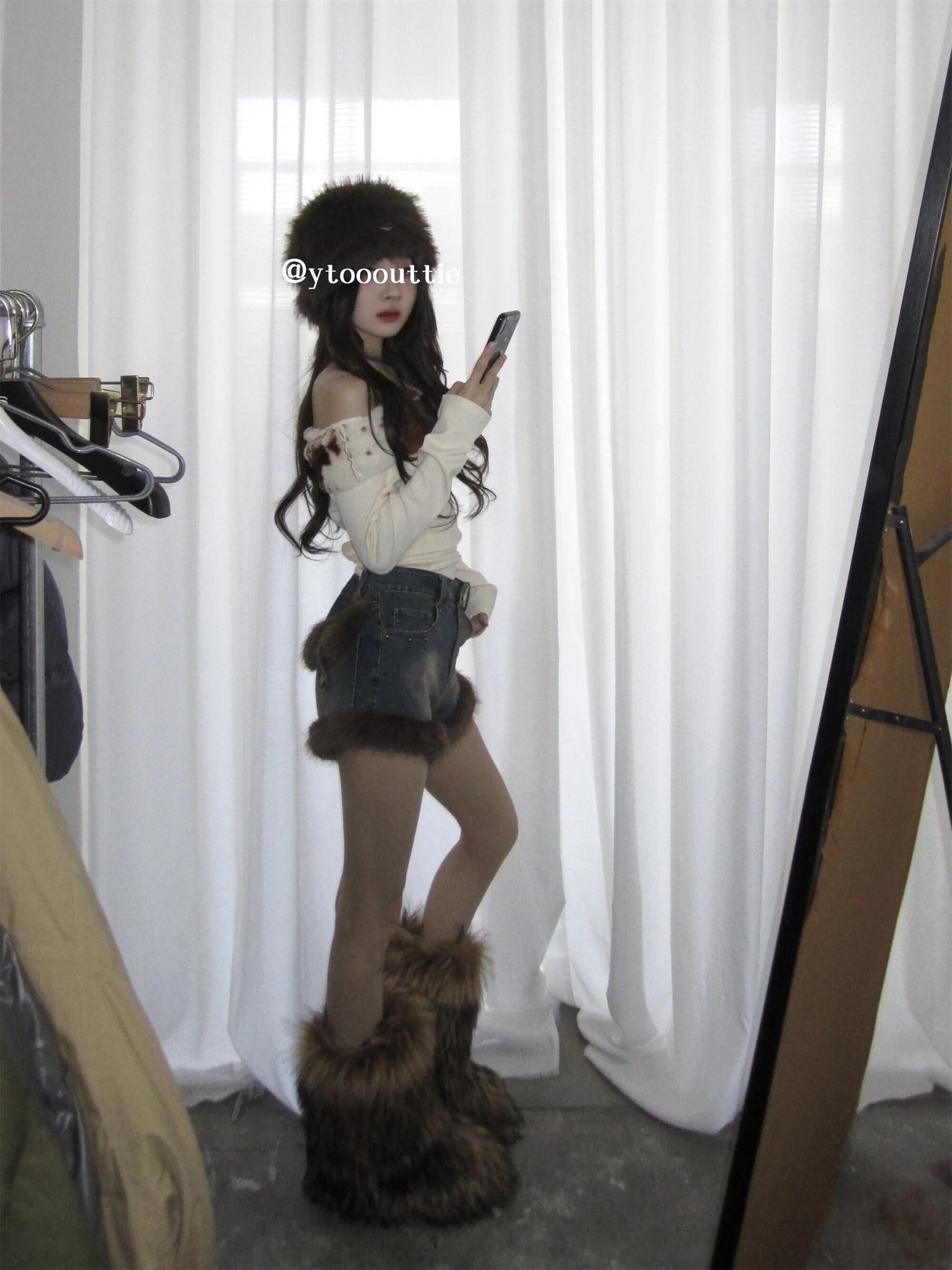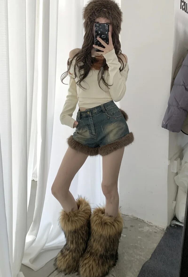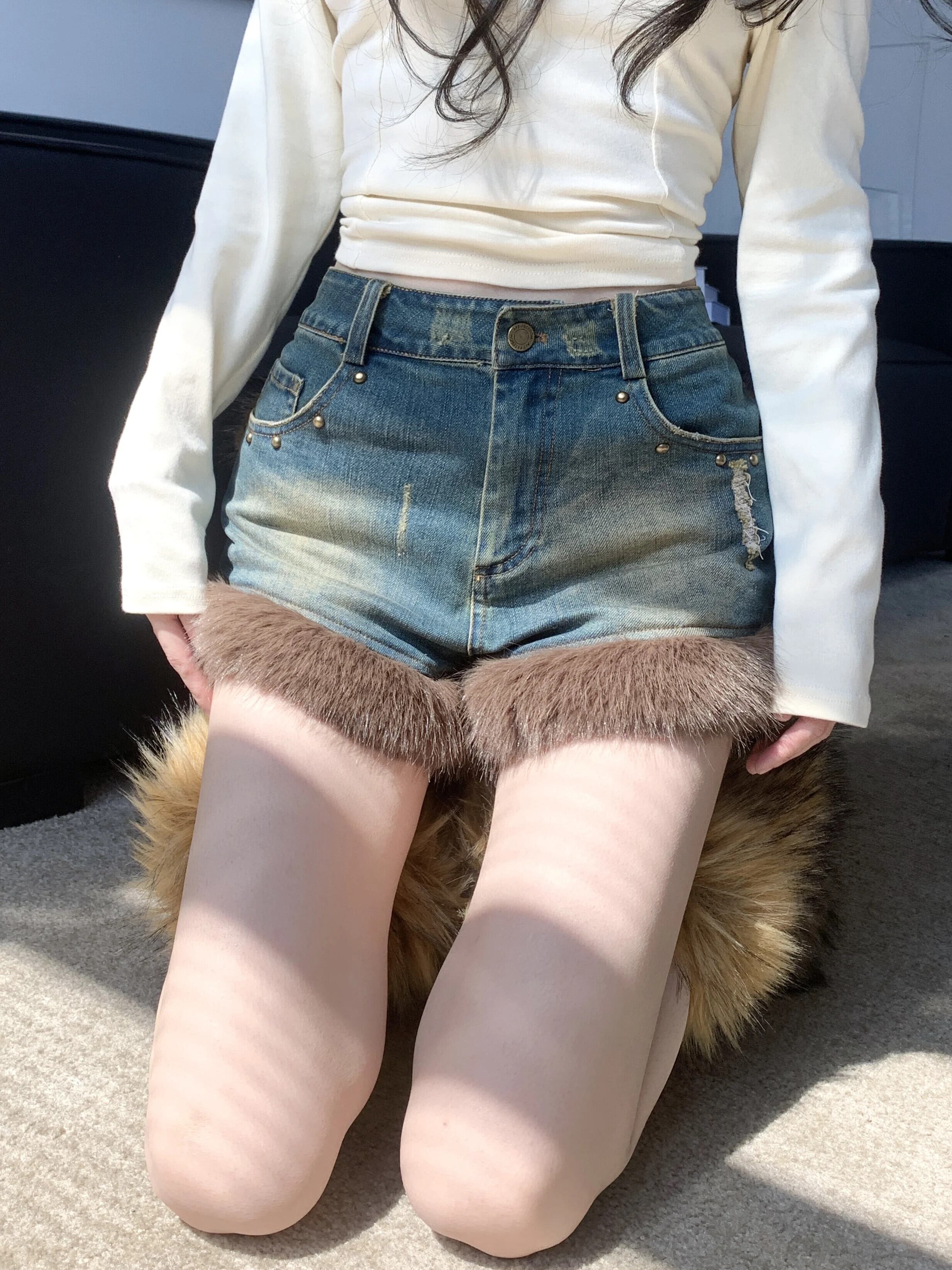 アメリカンスウィートホットガールぬいぐるみデニムショートパンツ秋/冬ウエストリベットフィット毛皮ようパンツ 大人ガーリー キュート カジュアル オータム 秋物 ウィンター 冬物 ショーツ ブルマー
