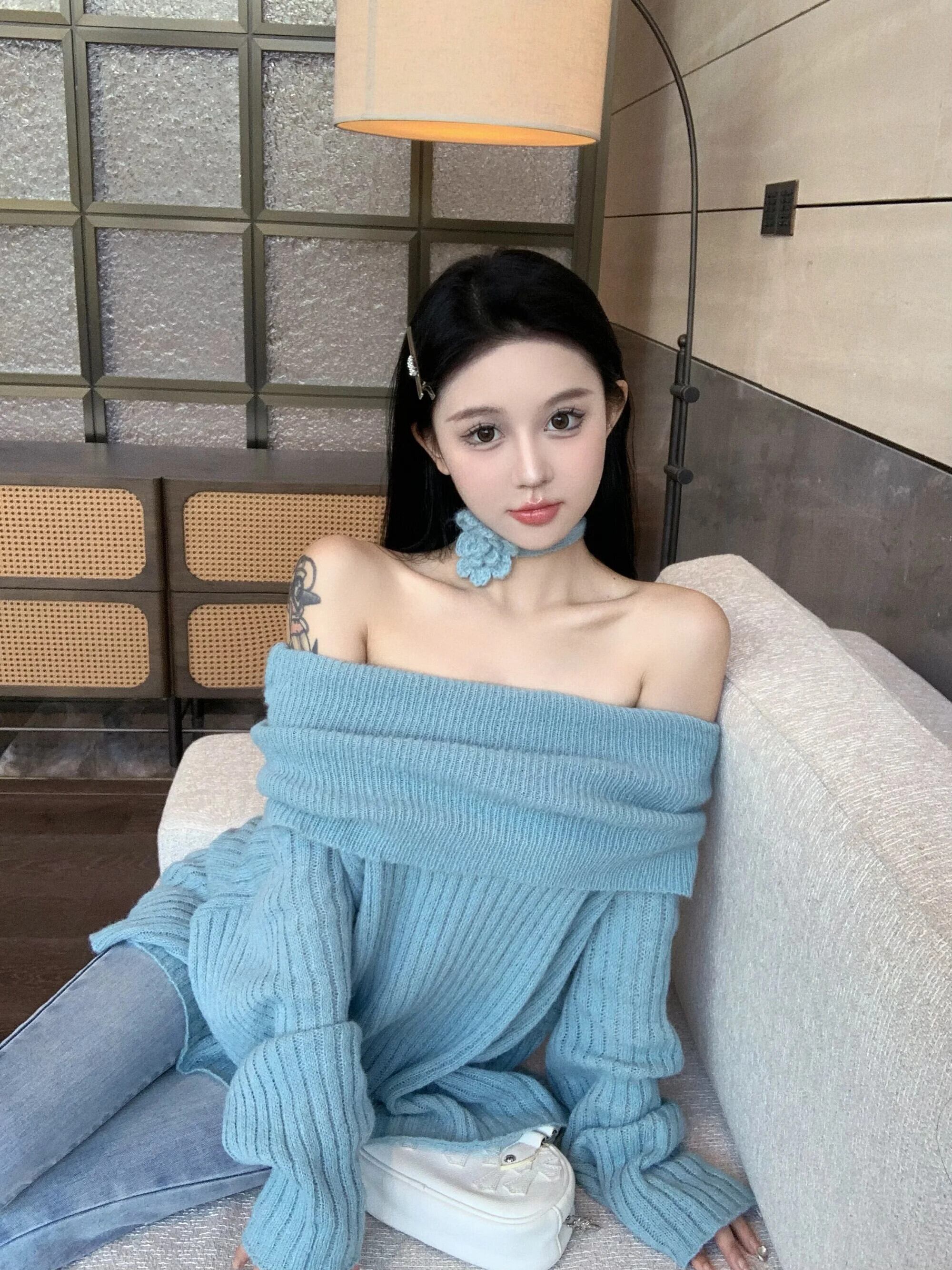 甘いホットガール長袖セーター秋オフショルダーレースアップフラワーニットプルオーバー ロング 大人ガーリー スウィート キュート カジュアル オータム 秋物 フラワーデザイン