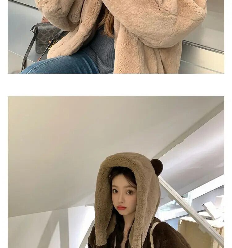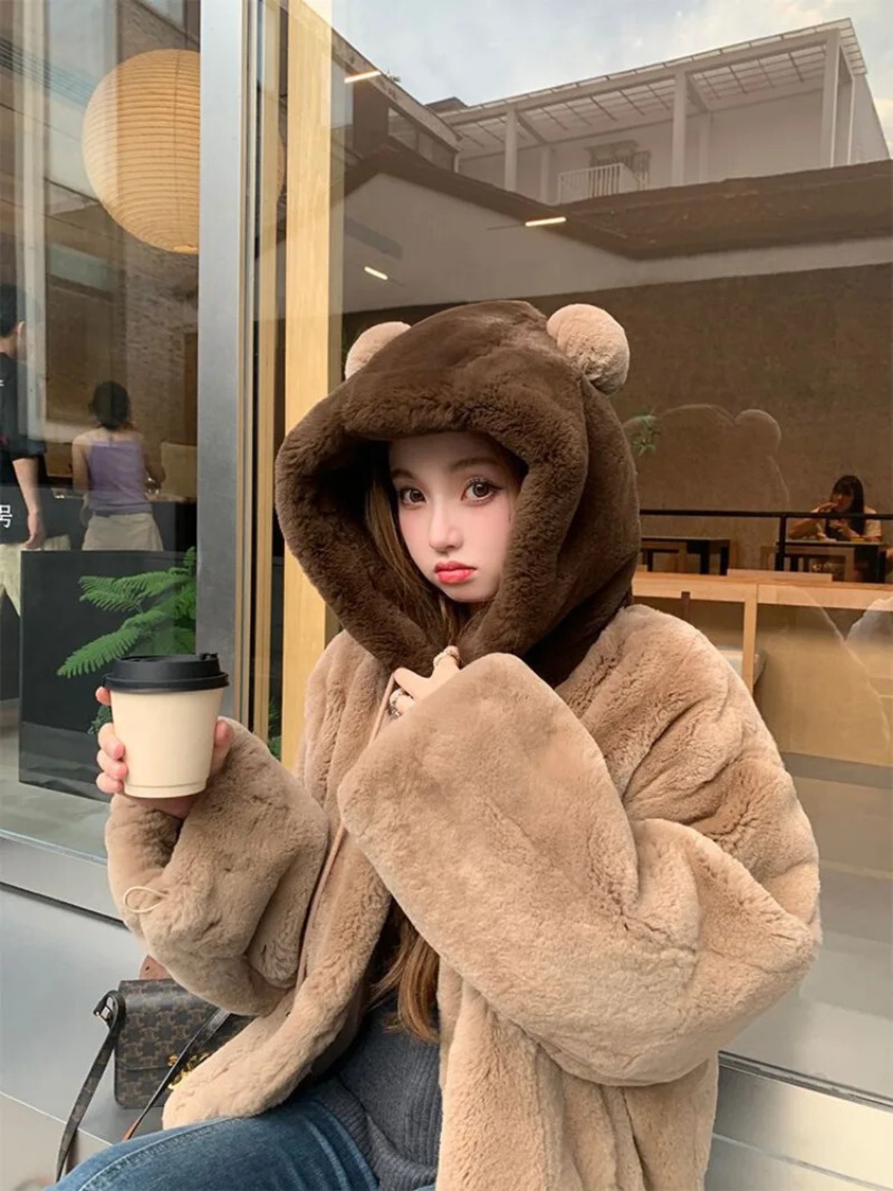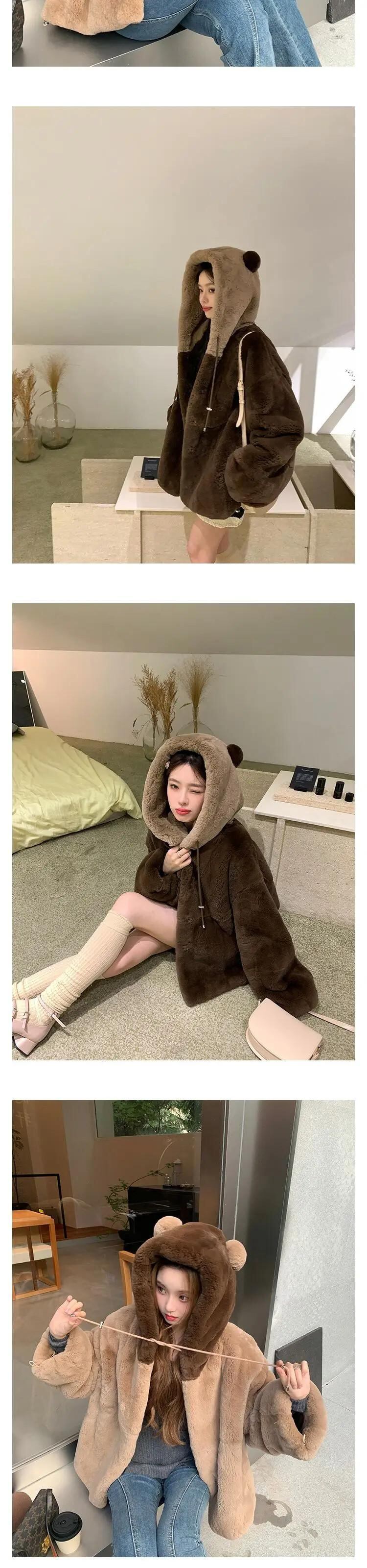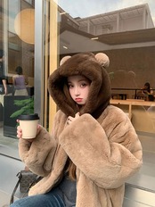 甘いホットガールかわいいクマ耳フェイクファーコート秋/冬フード付きルース肥厚毛皮ようジャケット 大人ガーリー スウィート キュート カジュアル オータム 秋物 ウィンター 冬物