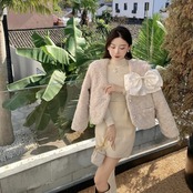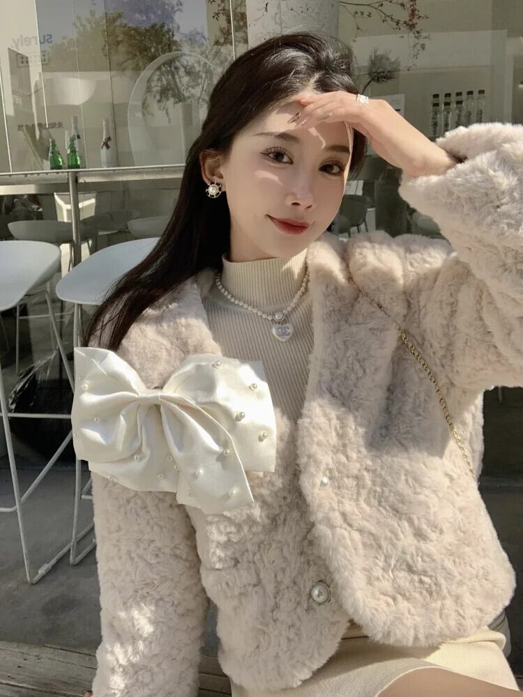 フレンチスイートホットガールフェイクファーコート秋と冬 V ネックビーズボウノットショートカーディガン リボン 大人ガーリー スウィート キュート カジュアル オータム 秋物 ウィンター 冬物 Vネック