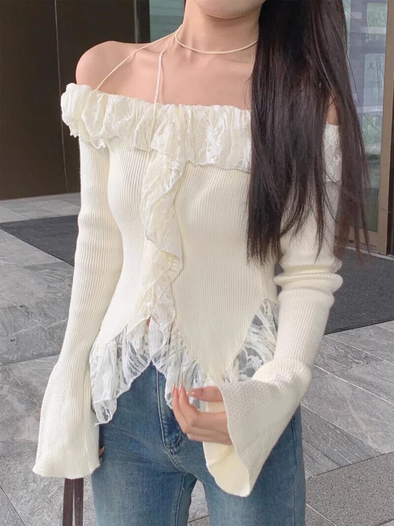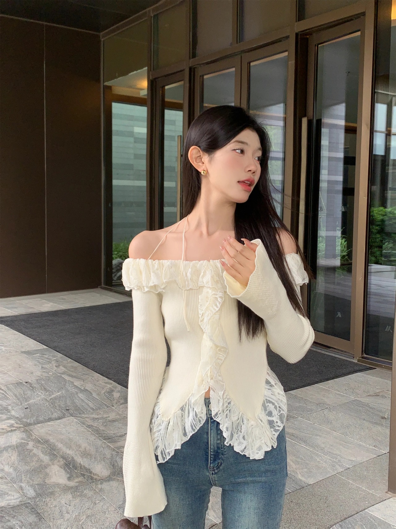 純粋セクシーオフショルダーレーススプライスショート不規則ニット秋/冬ホルターネック長袖セーター ロング オータム 秋物 ウィンター 冬物