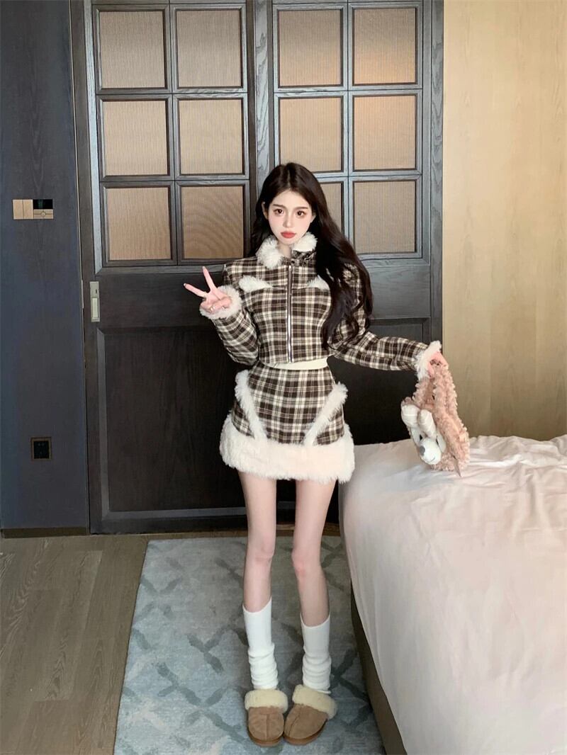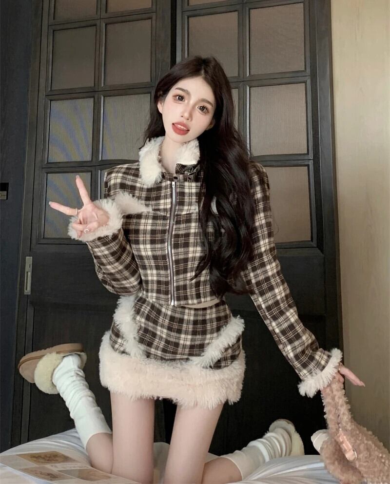 甘いホットガールスーツ秋/冬ツイードチェック柄ファー襟ショートコートウエストミニスカートツーピースセット 大人ガーリー スウィート キュート カジュアル オータム 秋物 ウィンター 冬物