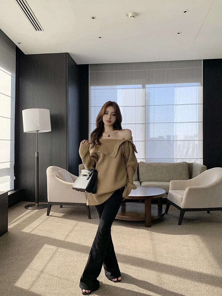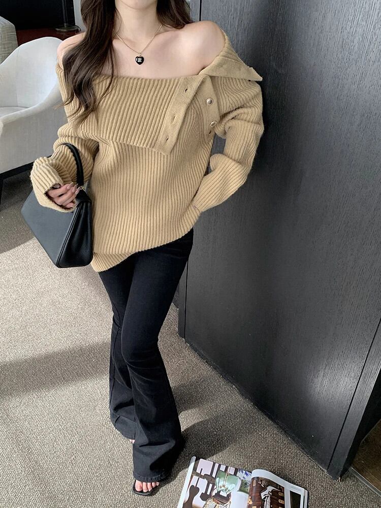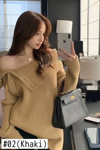 甘いホットガールオフショルダーニットプルオーバー秋/冬ミッドレングススラッシュネックルーズセーター 大人ガーリー スウィート キュート カジュアル オータム 秋物 ウィンター 冬物