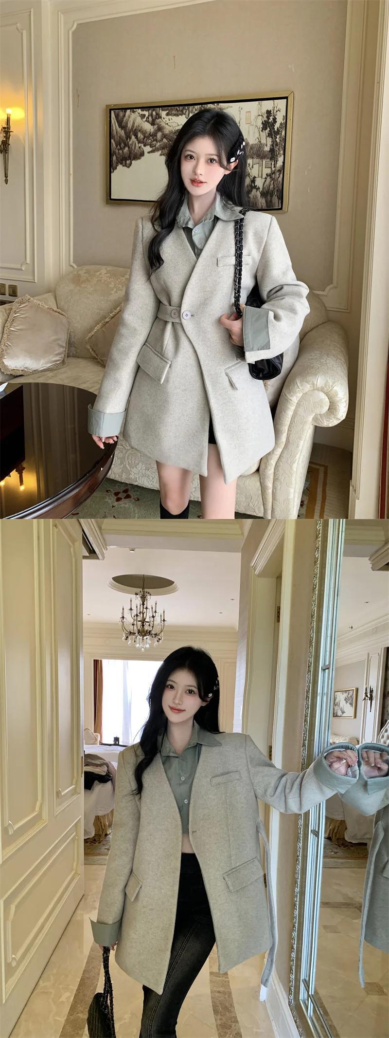 甘いホットガール偽ツーピースパッチワークウールコート秋と冬ルーズフィットミディアム丈ウールジャケット 大人ガーリー スウィート キュート カジュアル オータム 秋物 ウィンター 冬物