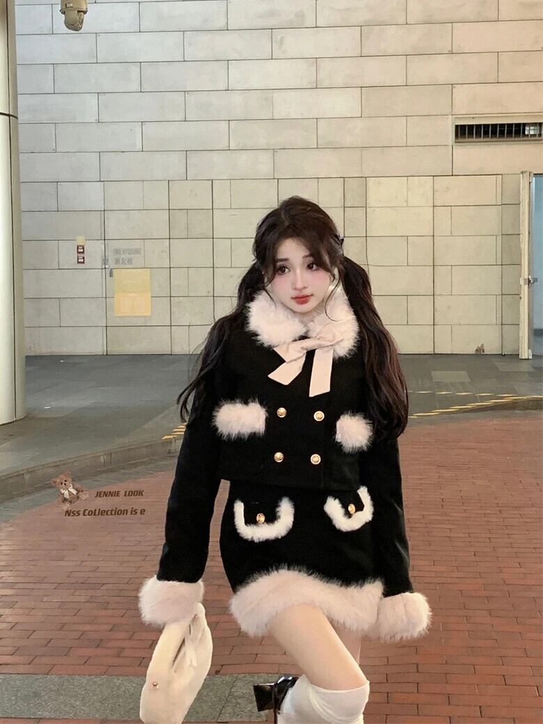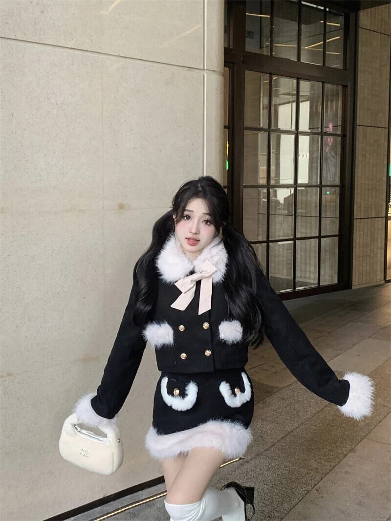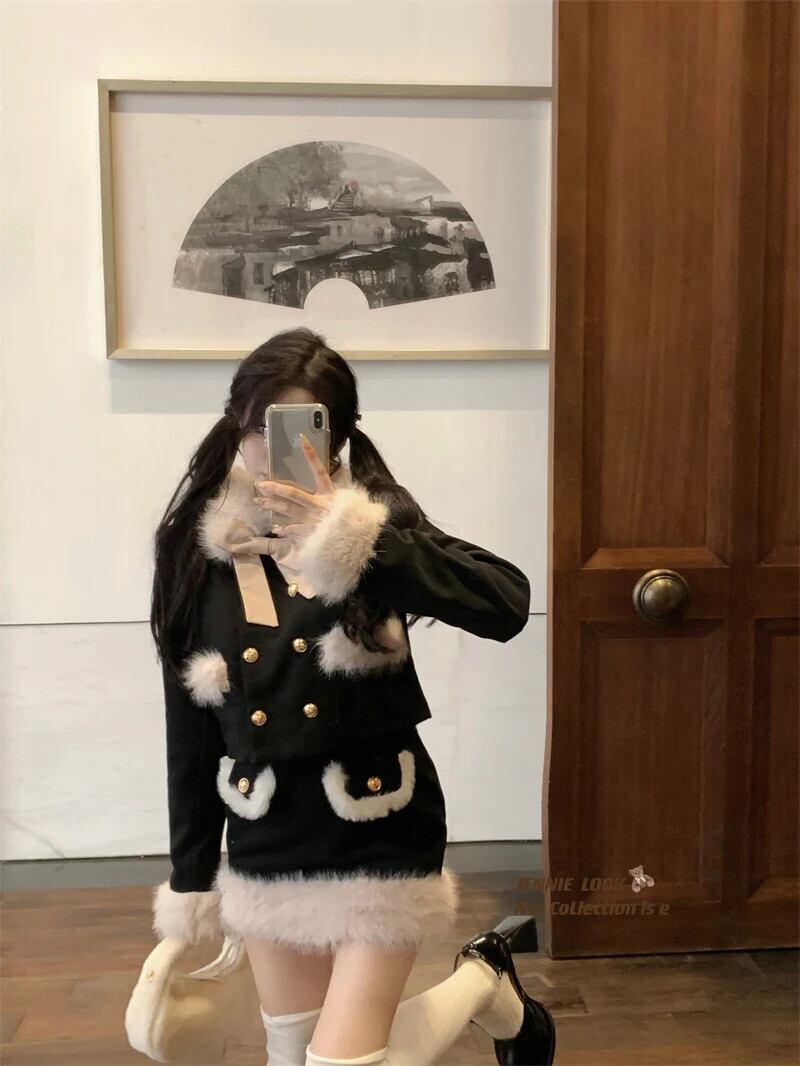 フレンチスイートガールスーツ秋と冬スプライシングファー襟ショートコートミニスカートツーピースセット 大人ガーリー スウィート キュート カジュアル オータム 秋物 ウィンター 冬物