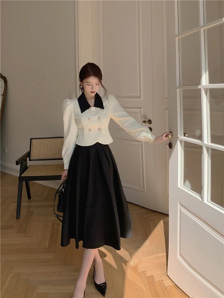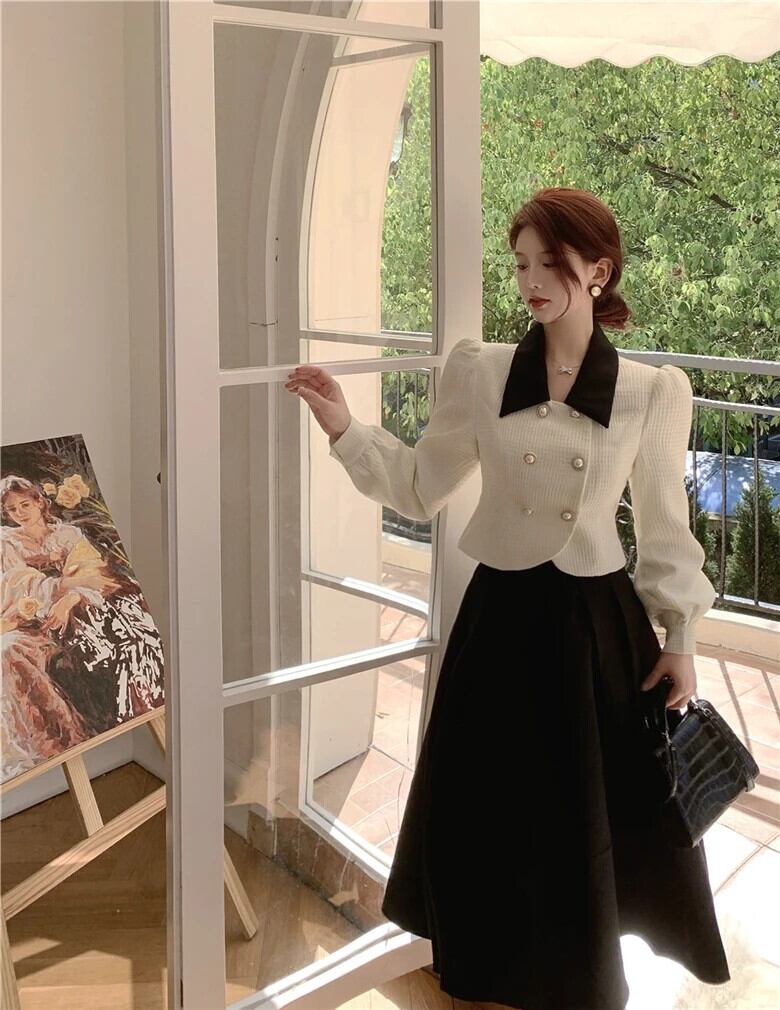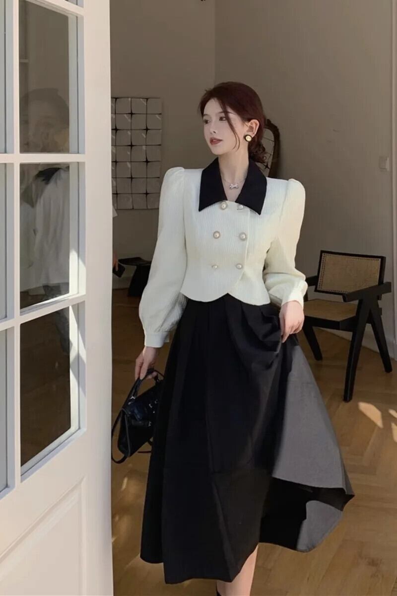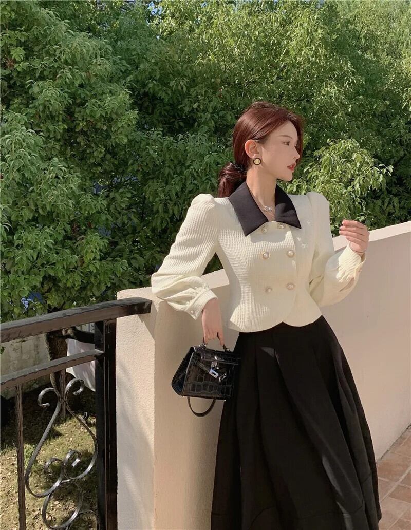 フレンチスウィートガールスーツ秋ダブルブレストコントラストコートウエストプリーツロングスカートツーピースセット 大人ガーリー キュート カジュアル オータム 秋物