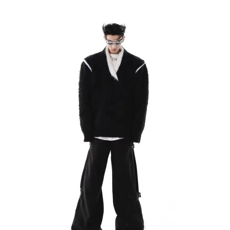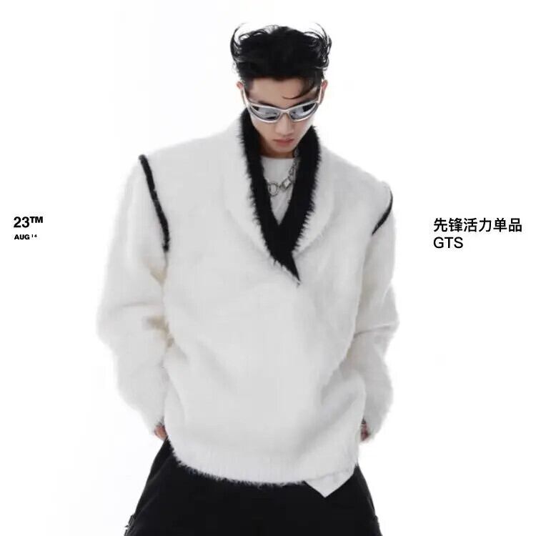 ストリート V ネックミンクぬいぐるみセーター男性秋と冬ルーズフィット厚いコントラストニットプルオーバー オータム 秋物 ウィンター 冬物 Vネック