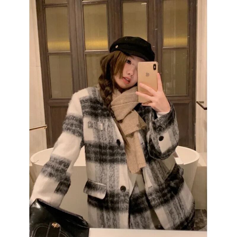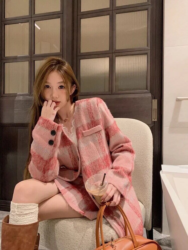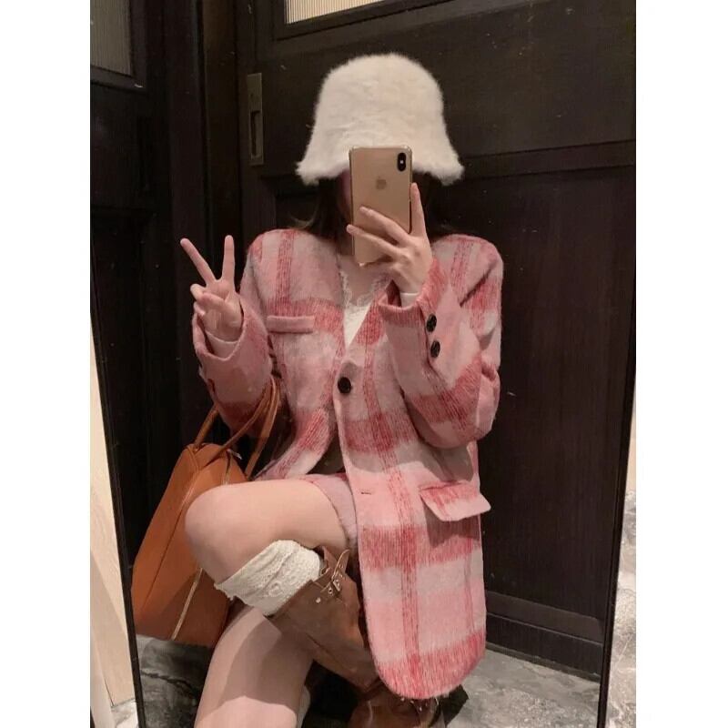 甘いホットガールチェック柄スーツ秋/冬 V ネック肥厚ウールジャケット A ラインショートスカート 2 点セット 大人ガーリー スウィート キュート カジュアル オータム 秋物 ウィンター 冬物 Vネック Aライン