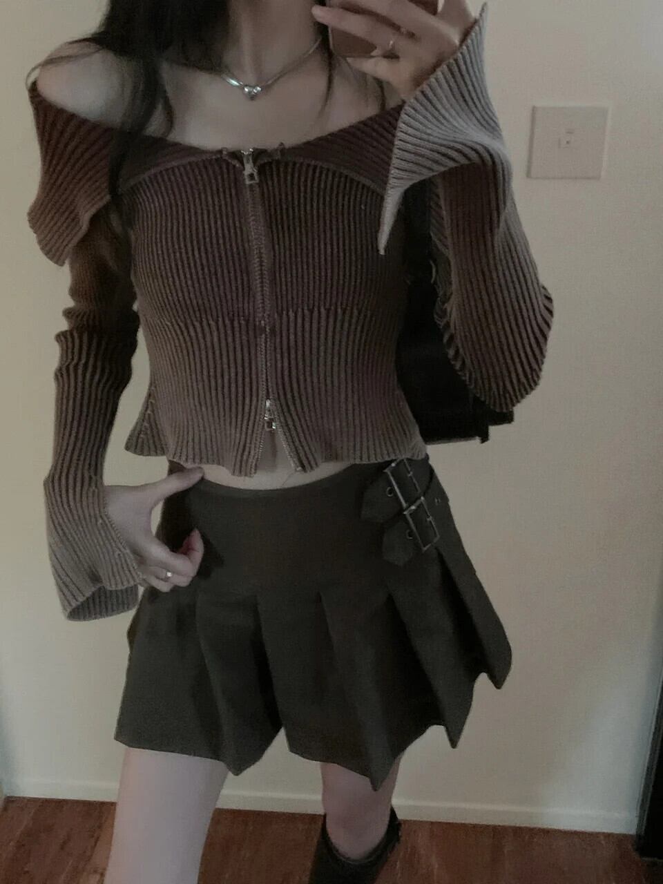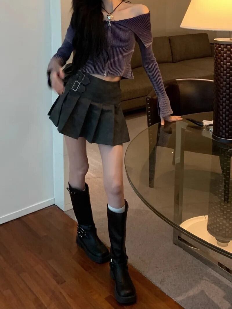 スイートガールスーツ秋オフショルダーポロネックジッパー長袖トッププリーツスカートツーピースセット ロング 大人ガーリー スウィート キュート カジュアル オータム 秋物