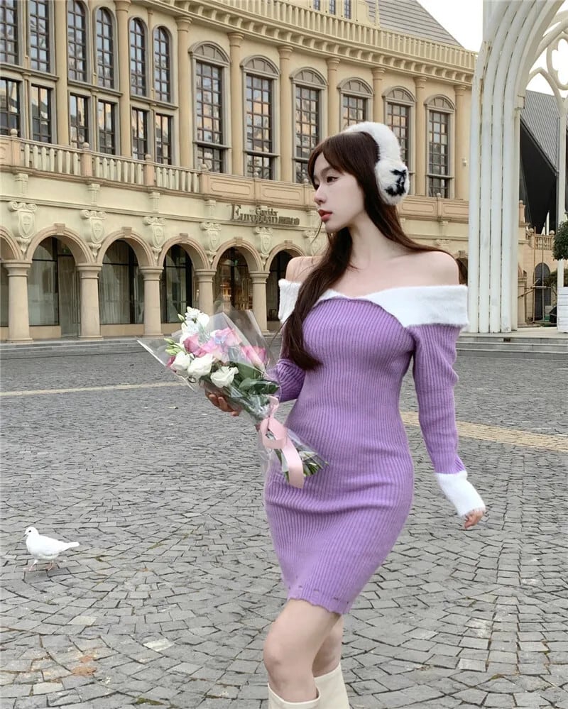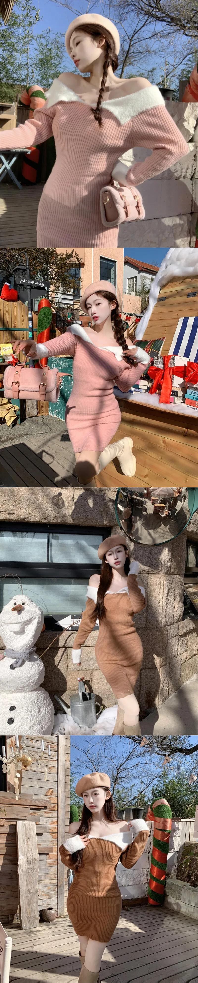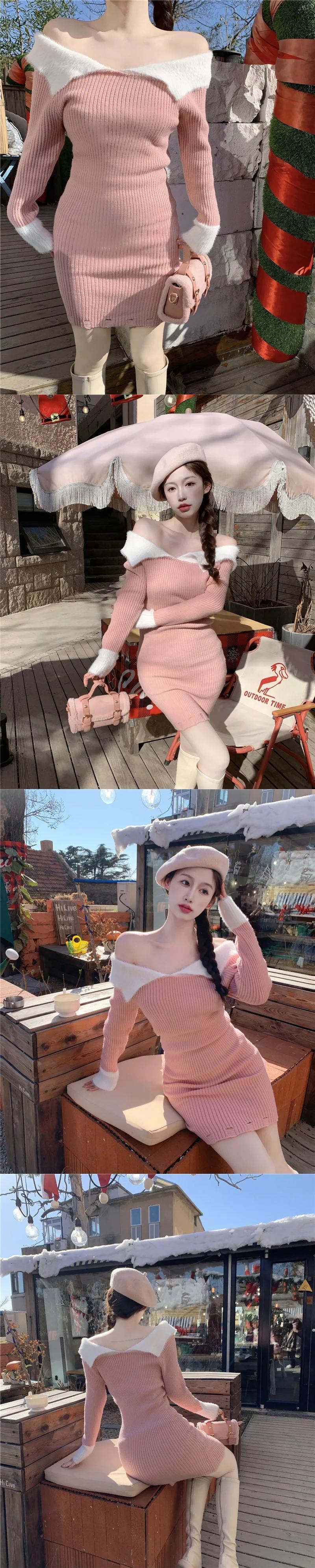 純粋セクシーホットガールオフショルダーミンクヘアドレス秋スリムフィットスラッシュネックラップヒップショートドレス オータム 秋物