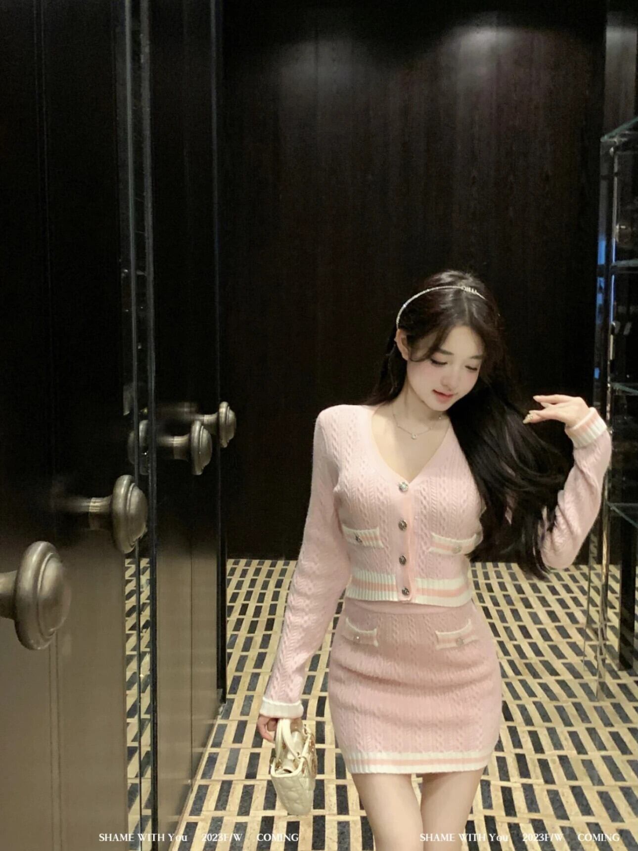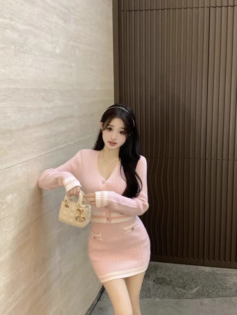 Sweet Girl スーツ レディース 秋冬 コントラスト 長袖 V ネック ニット カーディガン ラップ ヒップ ショート スカート 2 点セット ロング 大人ガーリー スウィート キュート カジュアル オータム 秋物 ウィンター 冬物 Vネック