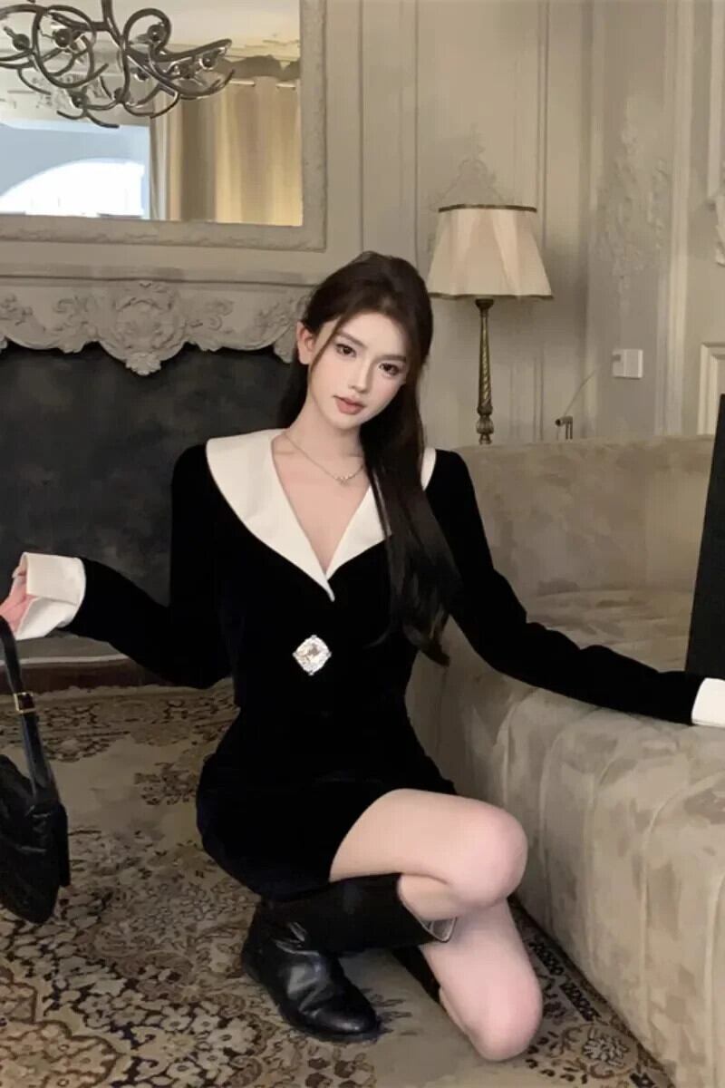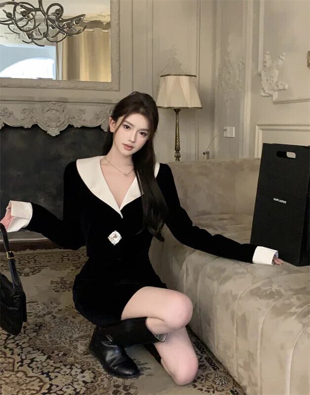 スイートガールスーツ秋サテンベルベットラインストーンターンダウン襟コートラップヒップミニスカートツーピースセット 大人ガーリー スウィート キュート カジュアル オータム 秋物