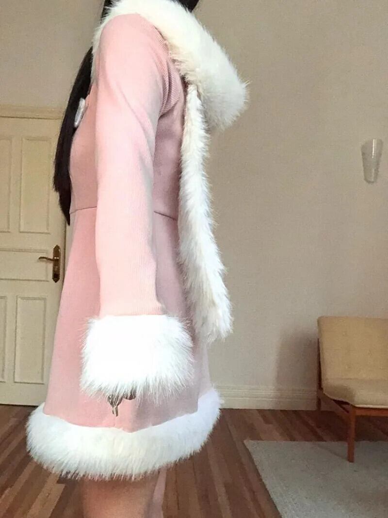 甘いホットガールピンク弓かわいいドレス秋と冬ウサギ耳スリムフィットフード付きロングドレス リボン 大人ガーリー スウィート キュート カジュアル オータム 秋物 ウィンター 冬物
