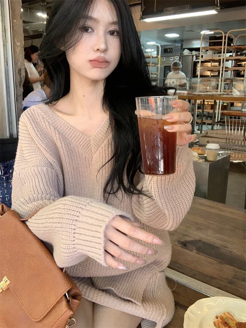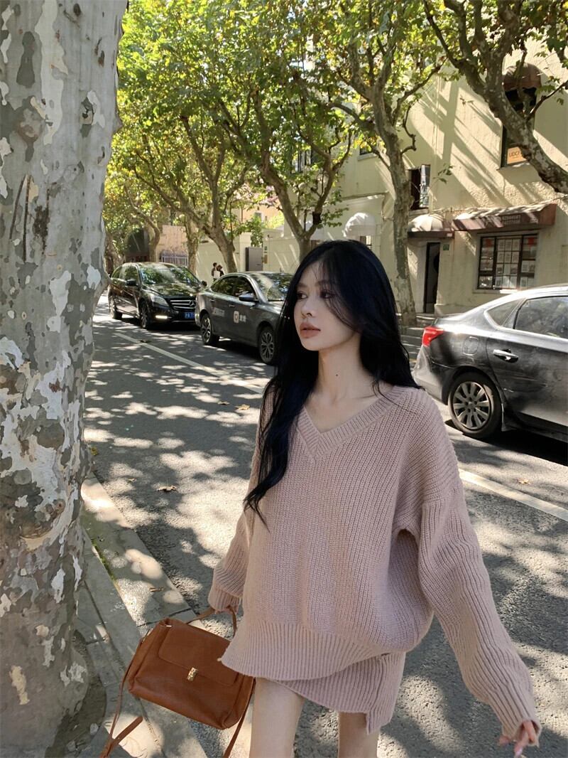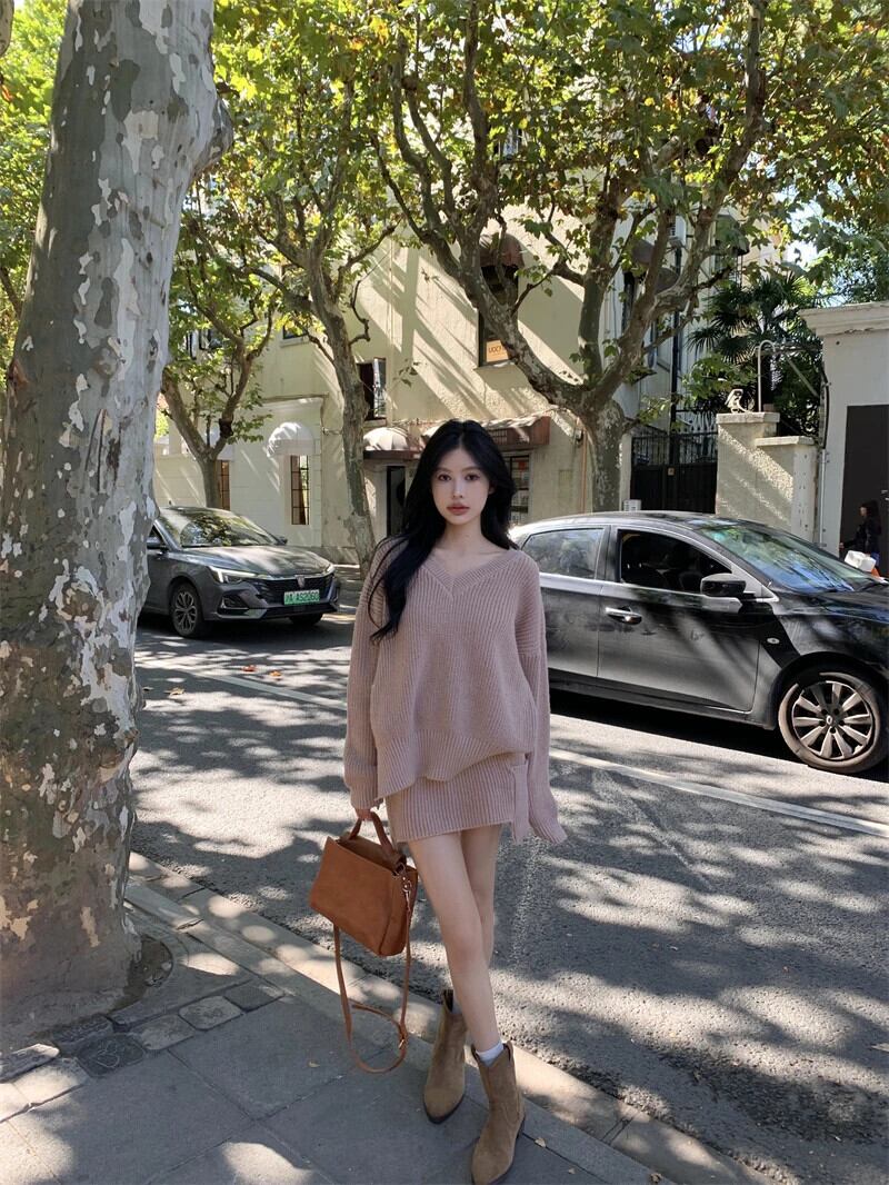 スイートガールスーツ冬ソリッド V ネックニットセーターウエスト不規則ミニスカート 2 点セット 大人ガーリー スウィート キュート カジュアル ウィンター 冬物 Vネック ソリッドカラー