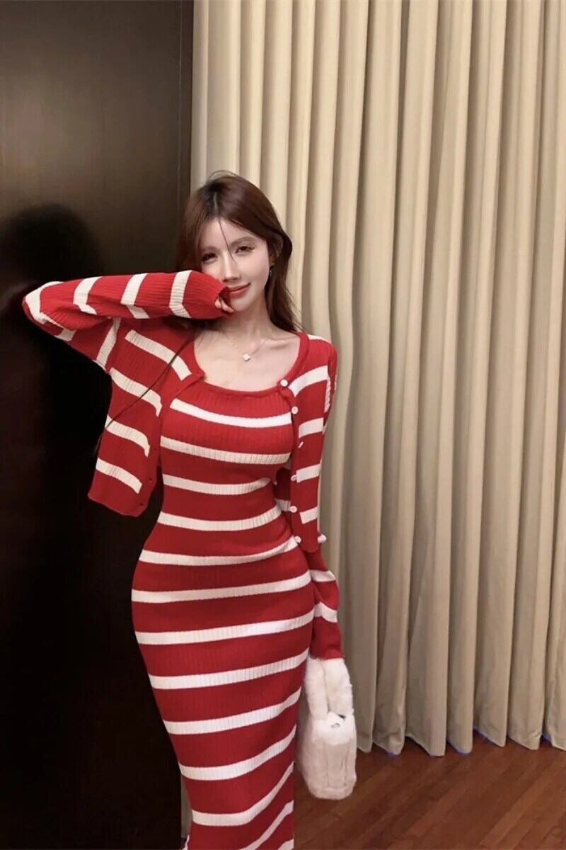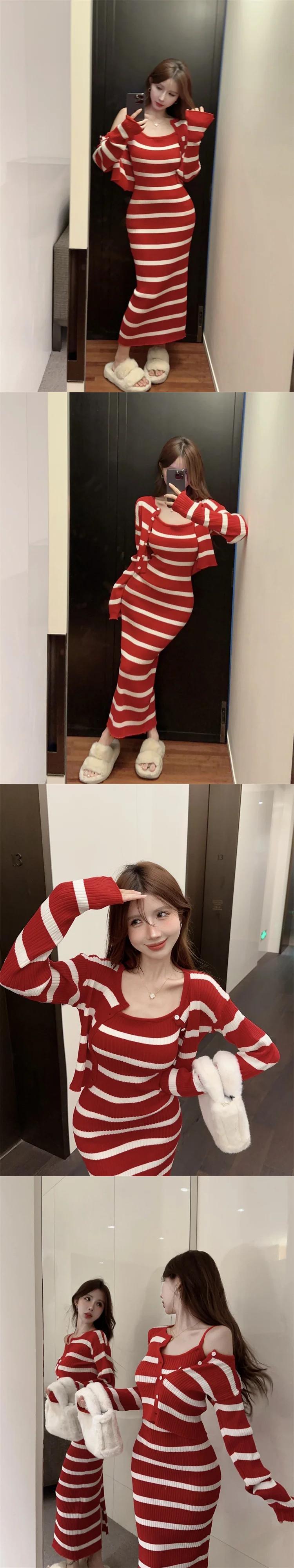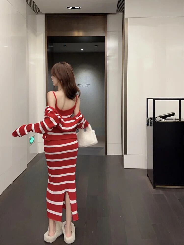 甘いホットガールスーツ秋ストライプスリムフィットストラップドレス長袖カーディガンツーピースセット ロング 大人ガーリー スウィート キュート カジュアル オータム 秋物